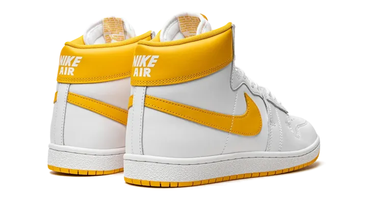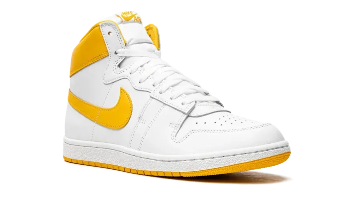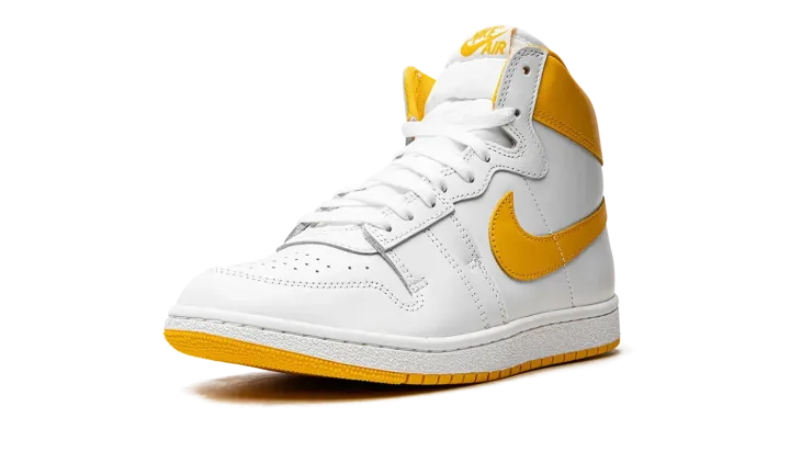 The Nike Air Ship "University Gold" is a new-for-2023 colorway of the retro basketball shoe that was notably worn by Michael Jordan during his rookie season with the Chicago Bulls. The Air Ship was originally released by Nike in 1984 and was worn by Jordan before switching to the Air Jordan 1. In the "University Gold" colorway, the shoe features a clean appearance with a white leather construction and University Gold accents. Specifically, yellow leather is found around the collar, on the leather Swoosh logo on the sides, and on the "Nike Air" and Swoosh branding on the tongue tag. Underfoot, a white midsole and University Gold rubber outsole complete the look.