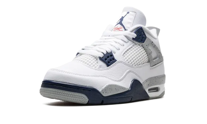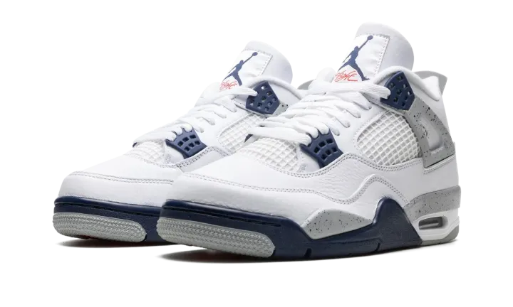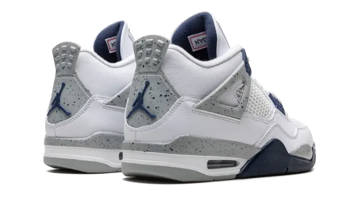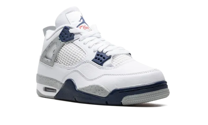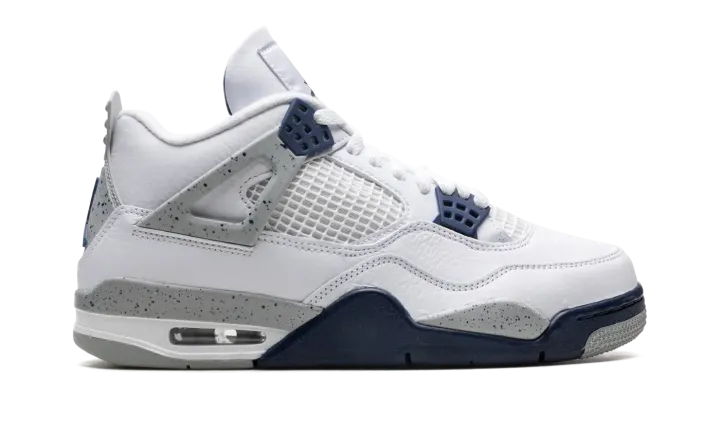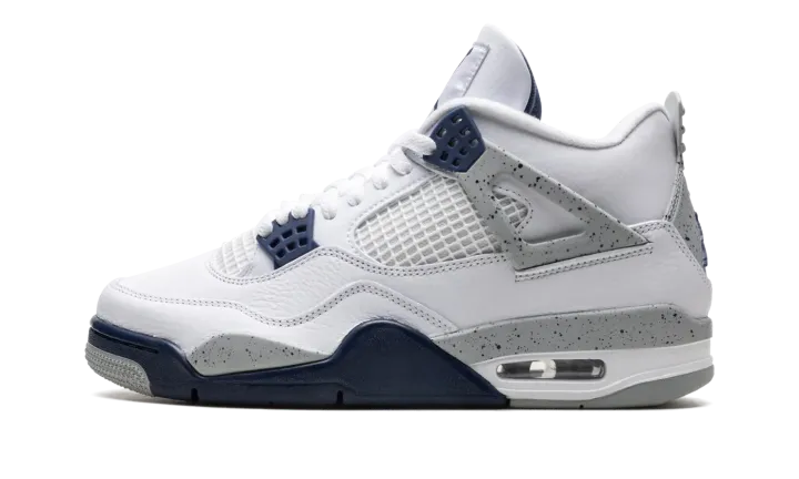 The Air Jordan 4 "Midnight Navy" is a colorway of Michael Jordan's fourth signature shoe inspired by the model's iconic "White Cement" style. The "Midnight Navy" replicates the color scheme of the Jordan 4 "White Cement," but replaces the shoe's red accents with navy. The upper is constructed from white leather, save for the tongue and mid-panel which feature tonal mesh detailing. Midnight Navy plastic lace holders are found on the throat and collar. The Jordan 4's signature "Cement" detailing appears on the "Wings" tabs, on the mudguard, and on the Jumpman and "Air" branded heel counter. A visible Air unit in the heel completes the design. Release date: October 29, 2022