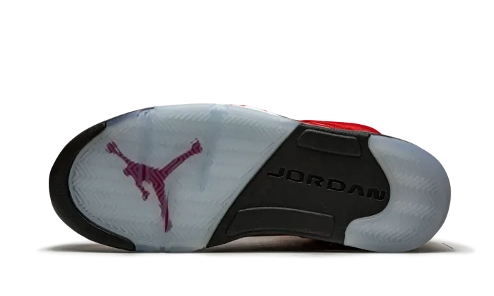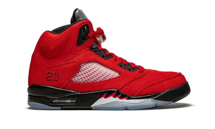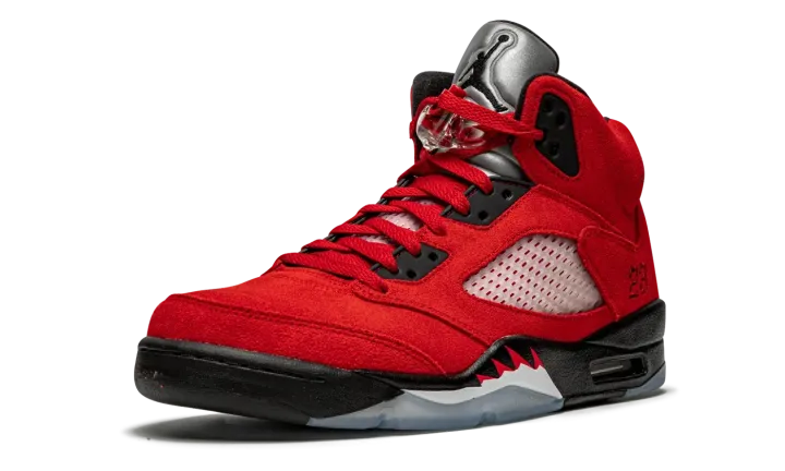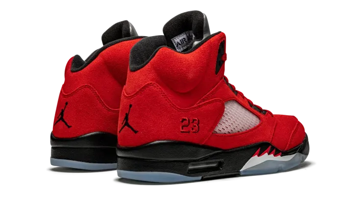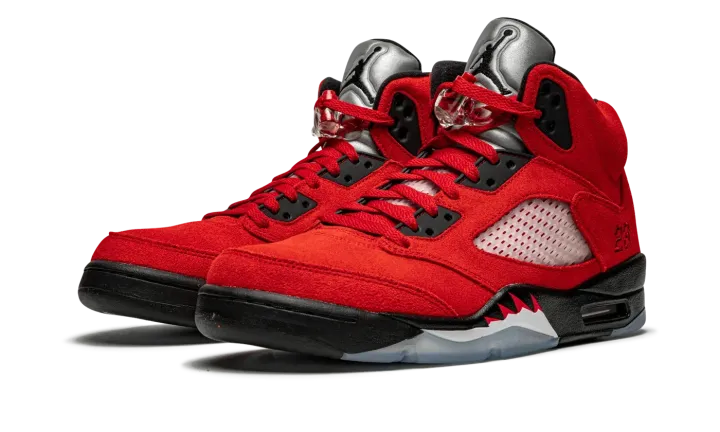The Air Jordan 5 "Raging Bull 2021" is the first-ever standalone release of one of the most popular non-original Air Jordan colorways. The "Raging Bull" or "Toro," as it's also referred to by sneaker collectors, was originally released in 2009 as part of a limited edition "Defining Moments Pack" that dressed Michael Jordan's fifth signature shoe in two styles: An all-red suede look and a reflective black design. Packaged inside of a shoe box mimicking a wooden crate, the "Defining Moments" Air Jordan 5 bundle remains extremely desirable to this day. As for the design of the modern re-release, Jordan Brand dresses the upper in a fiery shade of supple Varsity Red suede. Clear netting can be found on the mid-panel and tongue. The model's silver reflective tongue is inspired by the look of the original Air Jordan 5 "Fire Red - Silver Tongue." Like the OG "Raging Bull," the modern incarnation displays a black embroidered Jumpman on the tongue, a tonal "23" logo with black outlining on the lateral side, and a black Jumpman on the heel. The clear lace lock and red laces are a nod to the first "Raging Bull." Underfoot, the black painted midsole features red-and-white shark tooth detailing and a clear Air unit in the heel retains the Jordan 5's original design. Release date: April 10, 2021.