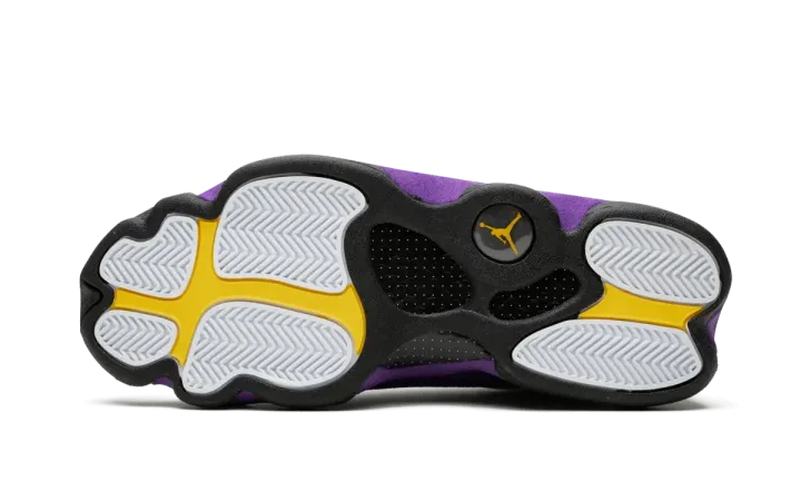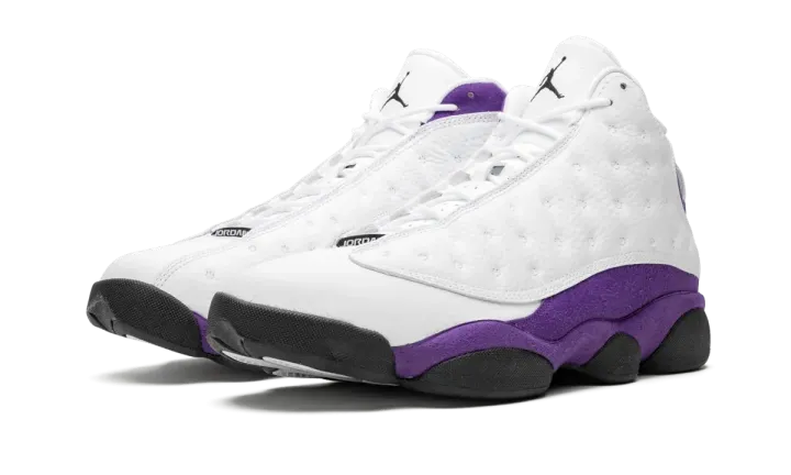 The Air Jordan 13 "Lakers" is dedicated to the Los Angeles Lakers and, more specifically, a memorable showdown between Michael Jordan and a young Kobe Bryant. Jordan, then in his final season with the Chicago Bulls, faced off against Bryant while wearing the Air Jordan 13 "Chicago" in 1998. The "Lakers" colorway features the same color blocking as the original makeup and substitutes the Lakers' "Forum Blue" hue along the heel and mudguard. The dotted white leather upper is contrasted by a smooth white leather toe. A holographic emblem denoting Jordan's "Black Cat" nickname, meant to resemble a panther's eye, can be found on the heel. Black embroidered Jumpman branding appears on the tongue. Black midsole pods finish off the look. The Air Jordan 13 "Lakers" was released on July 19, 2019.
