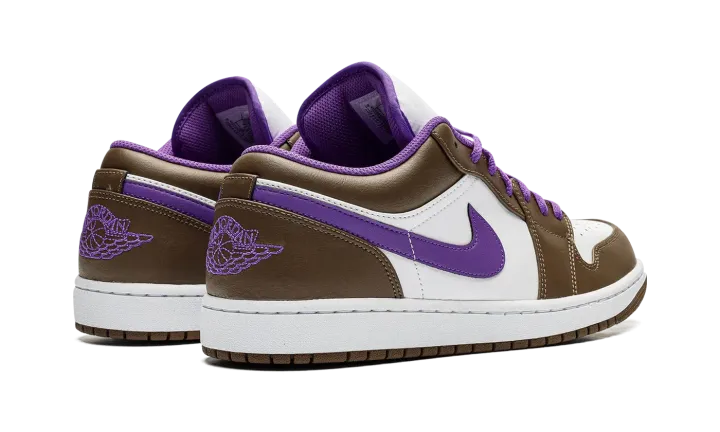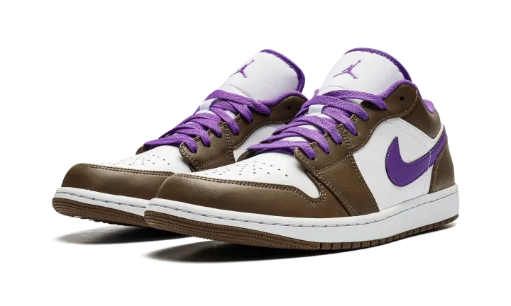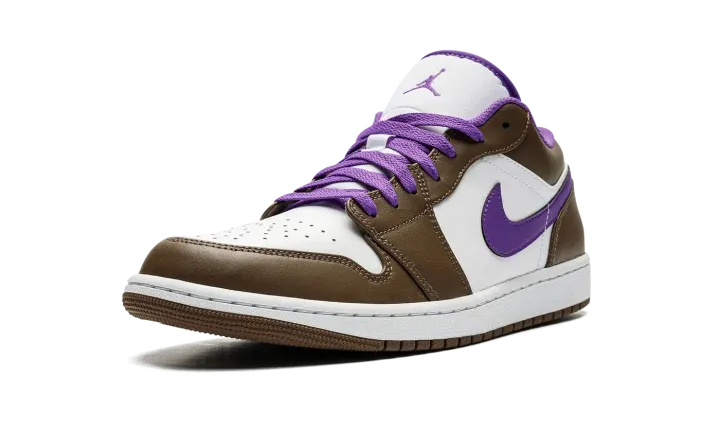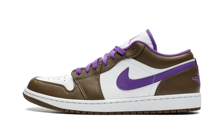 The Air Jordan 1 Low "Purple/Mocha" is a colorway of the low-top retro basketball shoe with a unique appearance. Keeping things clean and versatile, the shoe is equipped with a white leather base that gives way to contrasting Palomino (brown) leather overlays. A purple leather Swoosh is found on either side of the shoe. Purple "Wings" branding is embroidered on the heel. Underfoot, a white rubber midsole and brown rubber outsole complete the look. Release date: March 1, 2023