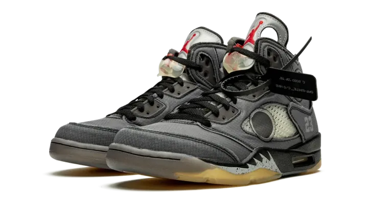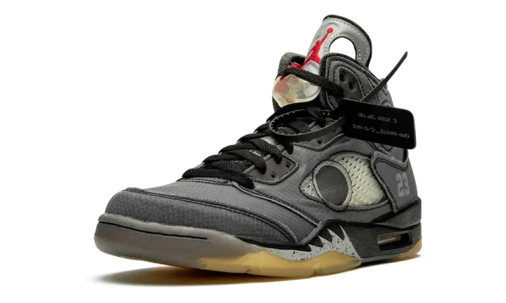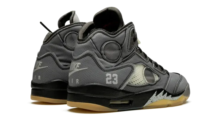The Off-White x Air Jordan 5 is Virgil Abloh's rendition of Michael Jordan's fifth signature shoe that incorporates the former's deconstructed design ethos. The NBA All-Star Weekend 2020 release omits the Jordan 5's traditional leather construction for a light grey synthetic, semi-translucent material. Circular designs with Abloh's signature Nike branding motif can be found on the inside of each shoe over the midfoot netting. For the first time ever on a non-original Air Jordan 5 colorway, embroidered Nike Air branding appears on the heel. White "23" detailing covers the heel near the midsole and a fiery red Jumpman covers the 3M-reflective tongue. A pre-yellowed outsole gives the Off-White Jordan 5 the already-worn-in vibe that Abloh often prefers to include on his collaborations with both Nike and Jordan Brand. Release date: February 2020.