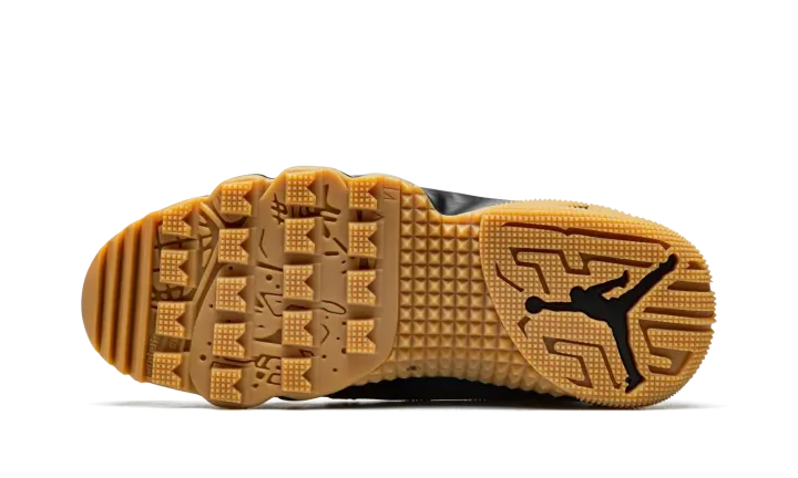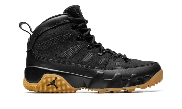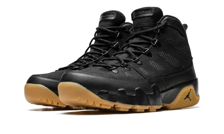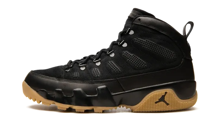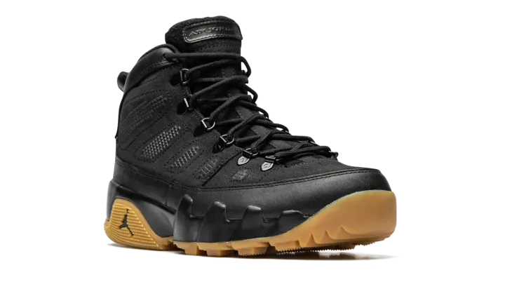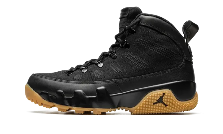 The Air Jordan 9 Boot "Black/Gum" is a November 2021 release of Michael Jordan's ninth signature basketball shoe recrafted as a winter boot. Originally released by Jordan Brand in 2017, the Jordan 9 Boot in "Black/Gum" returned as part of Jordan's Holiday 2021 release cycle, and is a one-to-one remake of the original style. Inspired by Nike's Special Field Boot, the Jordan 9 Boot has a black suede base with tonal leather detailing on the mudguard that spans the toe up to the collar. Both details have been treated with a water-resistant coating. Boot-inspired metal eyelets and a gusseted tongue provide a rugged look. A tonal "globe" emblem is found on the heel. The rugged sole with upgraded tread for inclimate weather is constructed in gum rubber. Release date: November 24, 2021