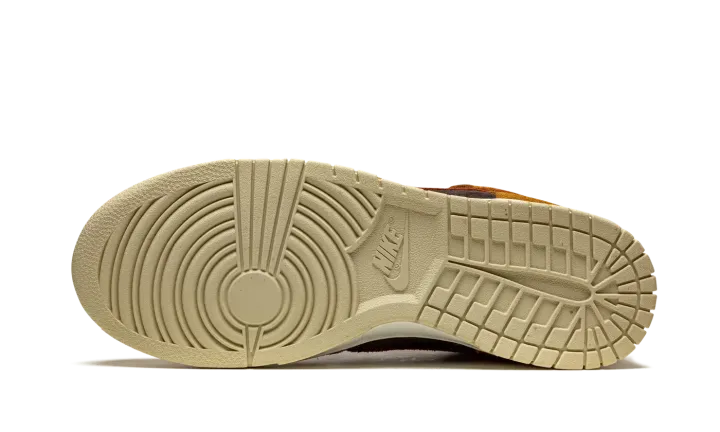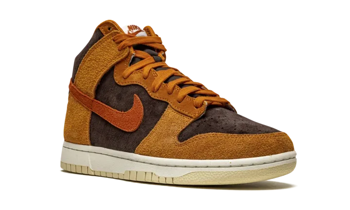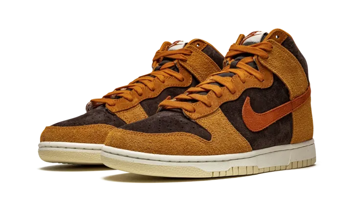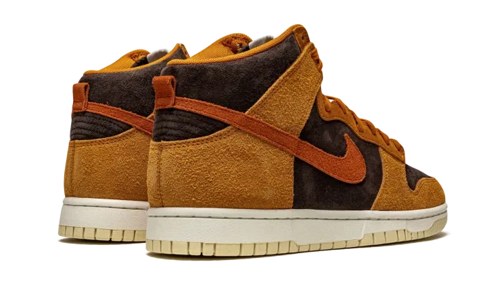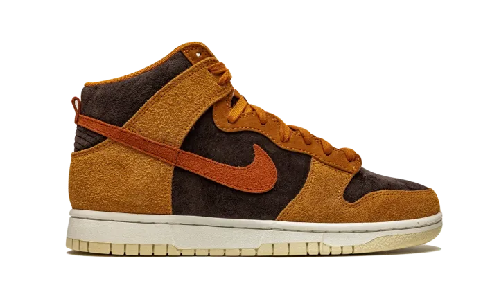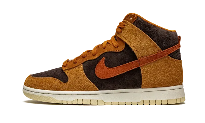 The Nike Dunk High "Dark Curry" puts an appealing lifestyle look on the timeless high-top shoe. The "Dark Curry" was released in March 2021 and exemplifies Nike's efforts of expanding the Dunk's footprint in sneakers. A year earlier, in 2020, the Nike Dunk re-emerged from relative obscurity to once again capture the attention of sneaker collectors due to an impressive amount of limited edition collaborations and returning retro colorways. As for the design of the "Dark Curry," hairy orange-brown suede overlays on the model's forefoot, eyelets, collar, and heel contrast the black brushed suede base. A darker shade of brown suede can be found on the Swoosh branding on either side and on the small pull tab on the heel. Nike layers brown laces over the black mesh tongue and adds a midsole for a timeless look. Underfoot, a tan outsole finishes off the look of the "Dark Curry." Release date: March 5, 2021.