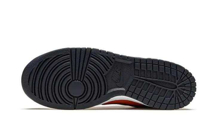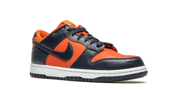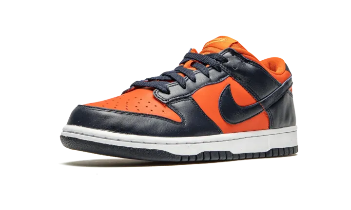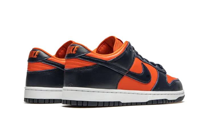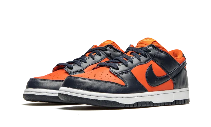 The Nike Dunk Low Retro "Champ Colors" is a special colorway dedicated to the 2019 Men's NCAA Basketball Champion Virginia Cavaliers. The Cavaliers' orange and blue team uniform colors appear on this low-top silhouette as part of the Dunks' 35th Anniversary celebration in 2020. Undoubtedly inspired by the "Be True to Your School" pack from 1985 which featured Dunks in exclusive colorways dedicated to some of the top college basketball programs in the country, this modern shoe features orange leather on the perforated toe, mid-panel, collar, and heel. Navy leather overlays appear on the forefoot, eyelets, and heel. A blue leather Swoosh graces both sides and orange embroidered Nike detailing dots the heel. The stark white midsole is contrasted by a blue outsole. The Nike Dunk Low Retro "Champ Colors" was released on June 24, 2020.