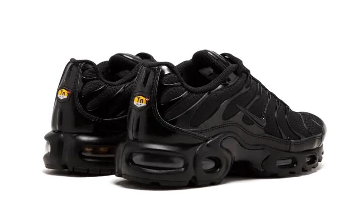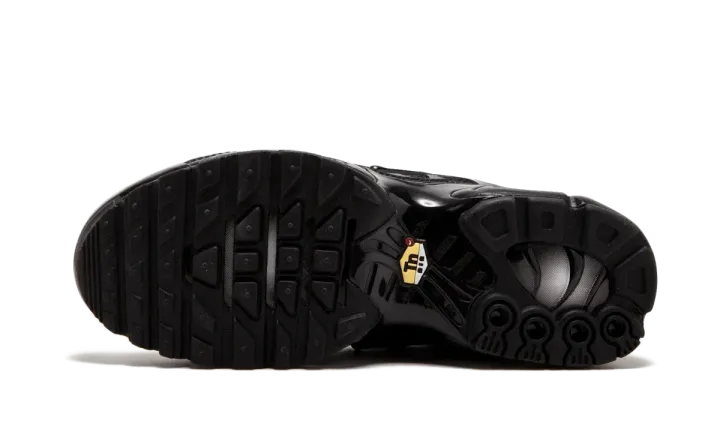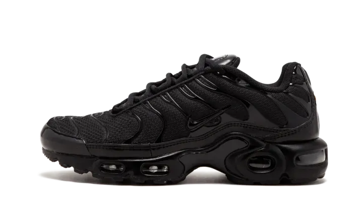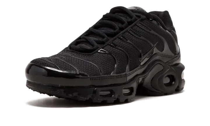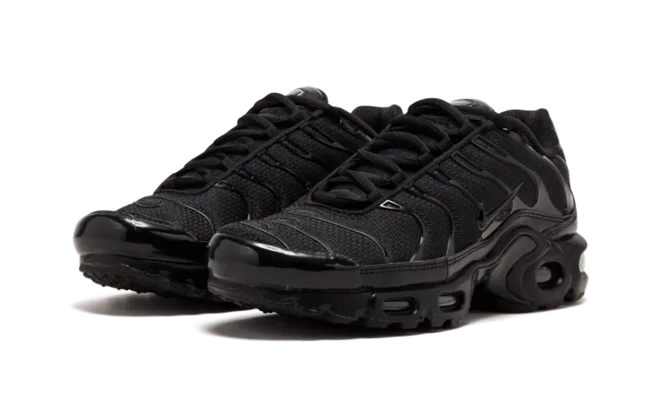 The Nike Air Max Plus Triple Black is an all-black rendition of the Nike Air Max Plus. Released ahead of the 20th anniversary of the Nike Air Max Plus, this shoe features a breathable synthetic upper with closed mesh inserts as well as edgy TPU ribbing, an external toe cap, a textured ankle strip, and a low mudguard. It also features a lightweight midsole with Tuned Air technology and a Max Air sole unit.
