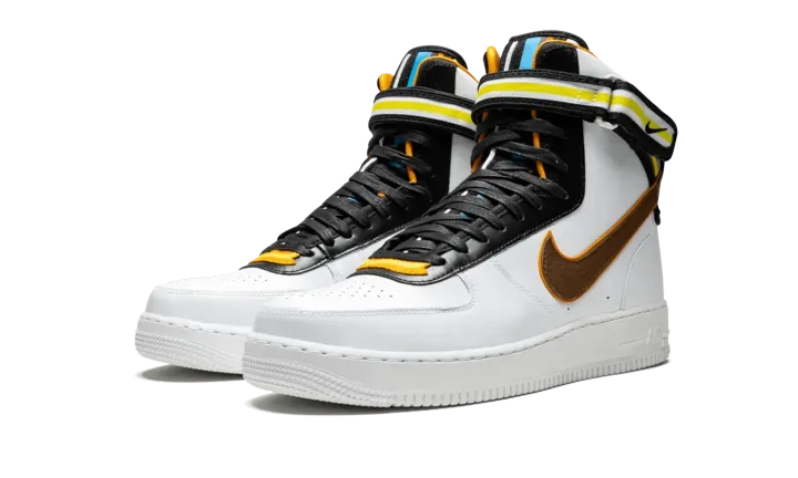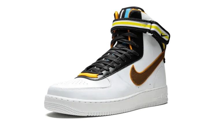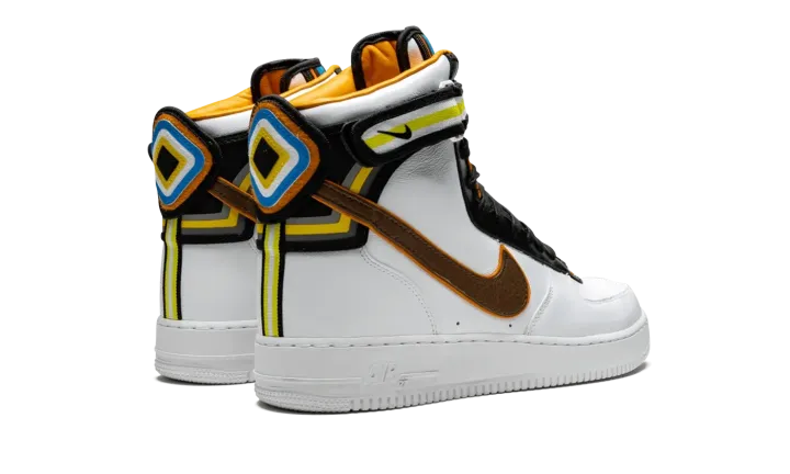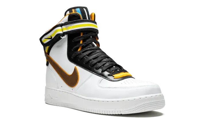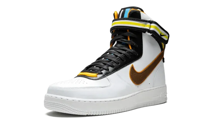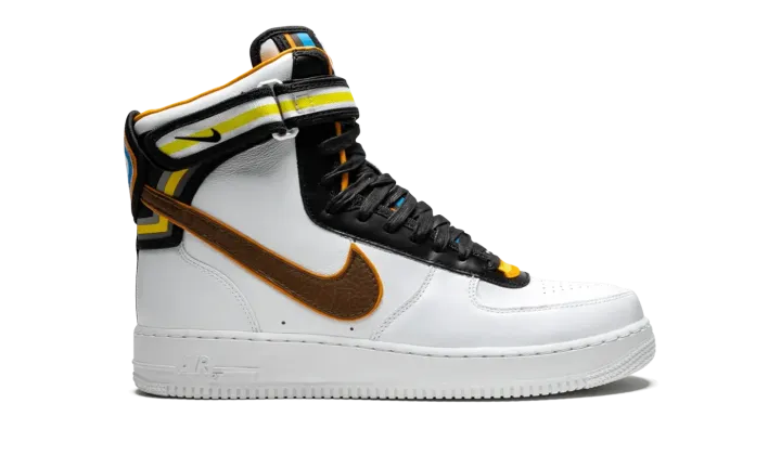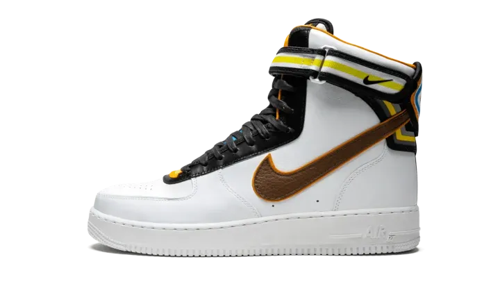 The Nike Air Force 1 gets an update for this bold collaboration with Italian fashion designer Riccardo Tisci. The Air Force 1 Hi SP Tisci features a modified design by Tisci with an extra high top and added paneling with striped motifs. The head-turning sneaker is crafted in premium white leather, with an ankle strap featuring woven polyester webbing. The shoe's tongue is accented with colorful overlays, while multicolor details also appear on the heel branding. A full-grain leather Swoosh is featured on the side panels, and a low-profile Phylon midsole includes an encapsulated Air unit for cushioning.