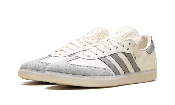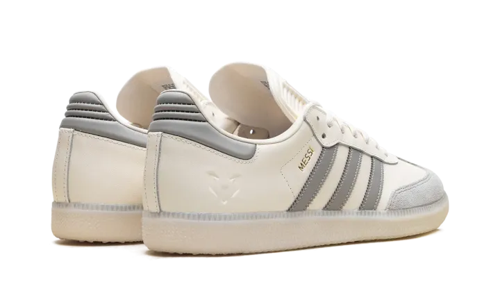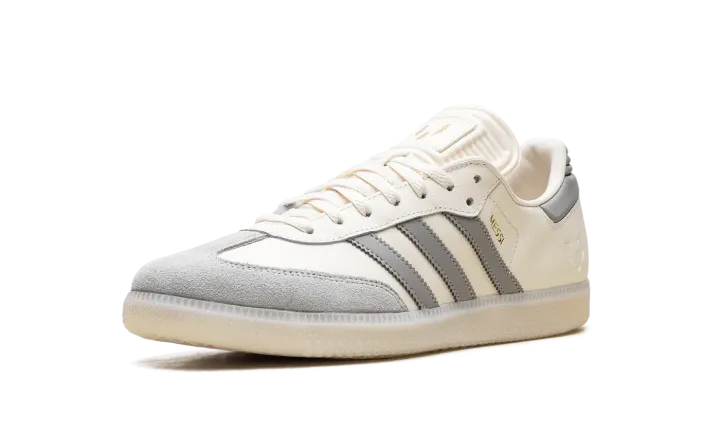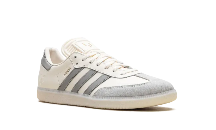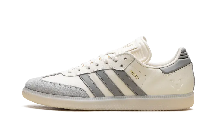 Step into soccer legend status with the Adidas Samba "Lionel Messi," the "GOAT's Classic," in a creamy "Cream White" colorway. This special-edition sneaker pays tribute to the icon with a luxurious leather upper and the signature suede T-toe. Gold foil "MESSI" lettering on the side and his personal logo on the tongue add a premium touch. Retaining the classic gum rubber outsole, this versatile shoe is a must-have piece of footwear history that celebrates the greatness of Leo Messi.