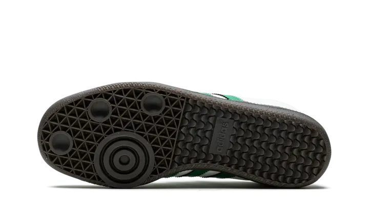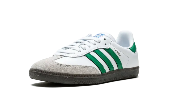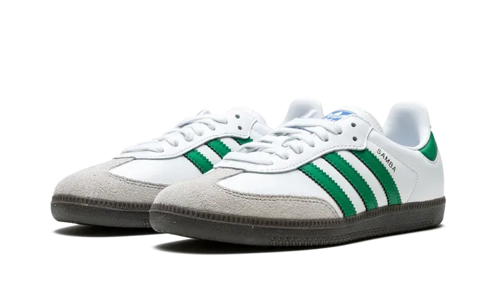 The adidas Samba OG "White/Green" is a colorway of the retro sneaker with a classic, two-tone color block. The adidas Samba is one of the most popular sneakers in the game, and certainly one of the most wearable, too, as evidenced by this easy to style colorway. The upper is complete with a white leather base and green leather Three Stripes branding on the sides. A gold foil "Samba" logo appears on the lateral side of the midfoot. Classic "adidas" detailing can be found on the tongue. Underfoot, a black rubber sole puts the finishing touch on the design.
