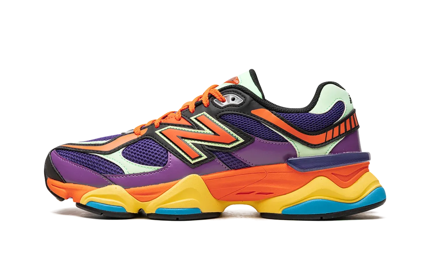 The New Balance 9060 "Prism Purple" is a colorway of the retro-looking lifestyle shoe with a neck-breaking arrangement of colors on its design. Certainly one of the most vibrant colorways of any New Balance shoe, the New Balance 9060 in "Prism Purple" features a purple mesh base with tonal, orange, and mint green leather overlays. An oversized orange "N" logo appears on the side. "NB 9060" branding is seen on the mint green leather tongue. Underfoot, the shoe is complete with an orange, yellow, and blue chunky rubber midsole. Release date: June 20, 2023
