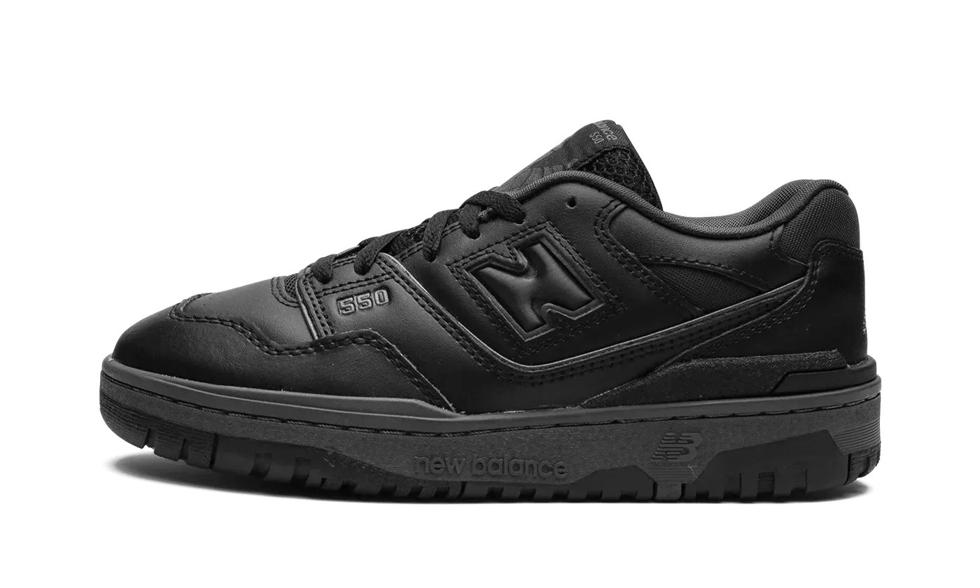 The New Balance 550 GS "Triple Black" is the youth sizing of the retro basketball shoe in a monochromatic black colorway. The "Triple Black" 550 for kids features an all-black leather upper with tonal leather overlays. Black "N" branding appears on the side and black "550" insignia is embroidered on the lateral side of the forefoot. Black "NB" detailing is seen on the heel. To complete the all-black design, the shoe has black "New Balance 550" branding on the tongue and a black rubber sole.