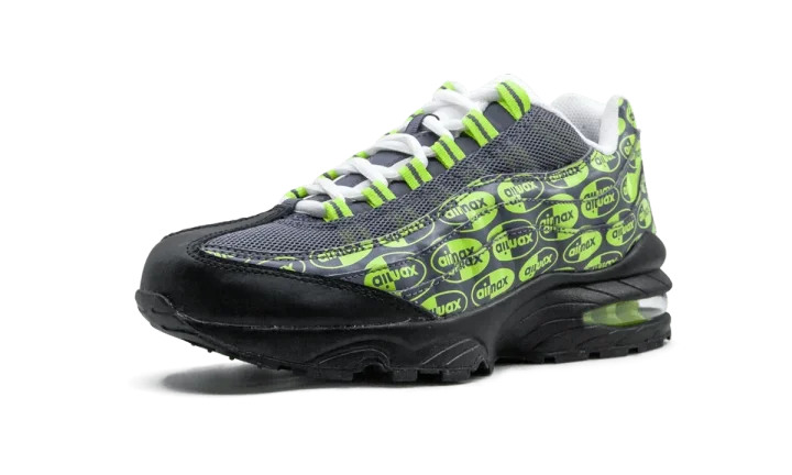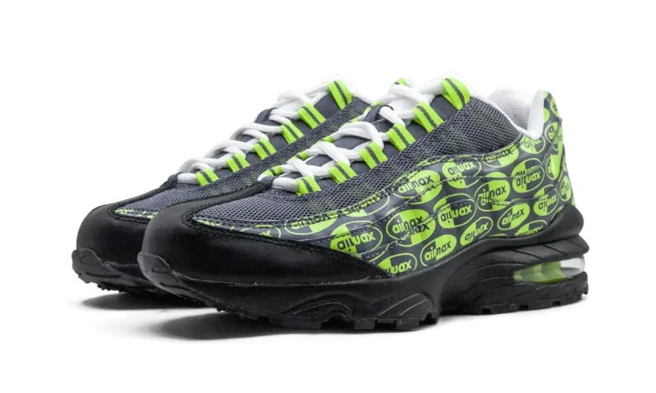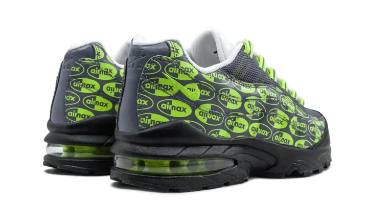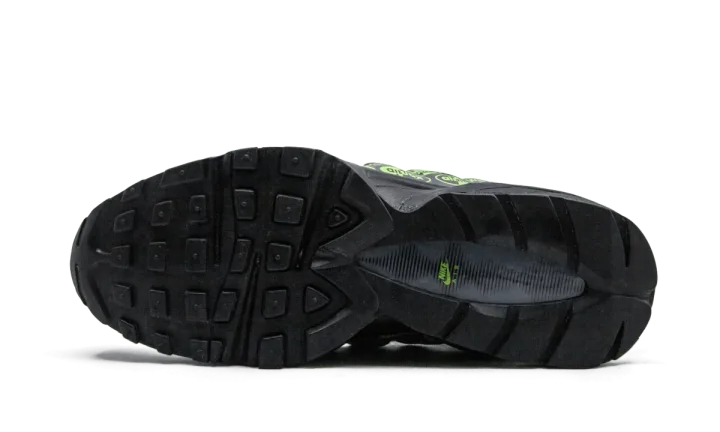 The Nike Air Max 95 SE (GS) "Black/Volt" is the youth sizing of one of Nike's most timeless silhouettes, with a fun redesigned pattern. Several alterations are applied to the design. An all-over neon green print Air Max pattern covers the mid-panel and heel. Light grey mesh can be found on the eyelets and extends down to the forefoot. A black leather toe contrasts the look of the upper. Nike outfits the shoe with a thick black midsole with a visible Air unit in the heel.