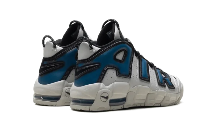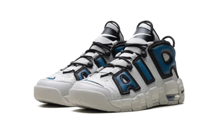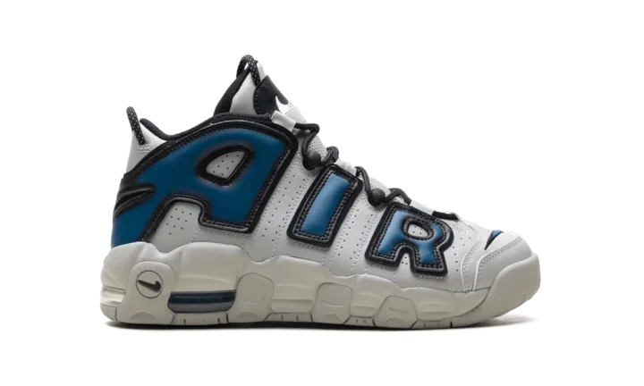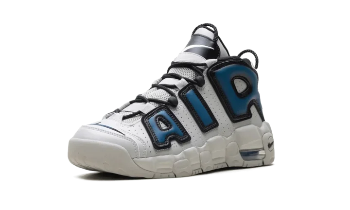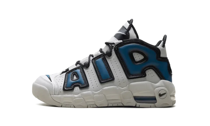 The Nike Air More Uptempo GS "Industrial Blue" is the youth sizing of the colorway of the retro basketball shoe with head-turning blue detailing. The Air More Uptempo was worn by Scottie Pippen with the Chicago Bulls in 1996. Today, the model is beloved for its '90s-inspired styling, ties to Pippen, and for its eye-catching colorways like the "Industrial Blue." The shoe has a White Bone leather upper with Industrial Blue leather "AIR" detailing on either side with an airbrush-like effect of black outlining. The blue hue also appears on the Swoosh on the toe and on the heel. An Air cushioning bubble in the heel completes the design. Release date: June 10, 2023