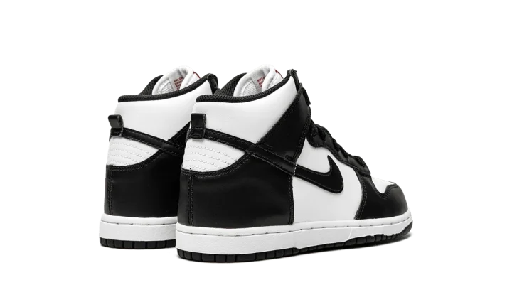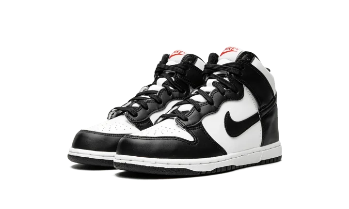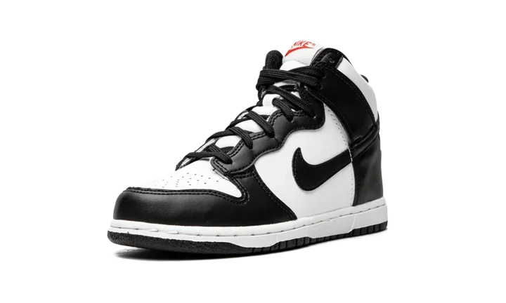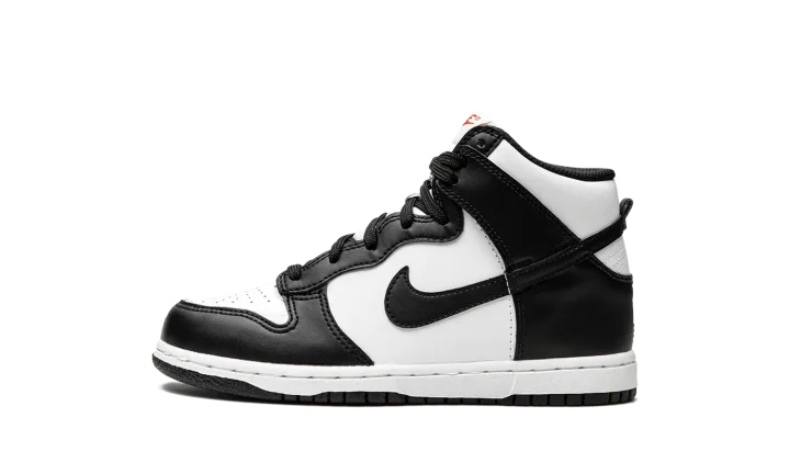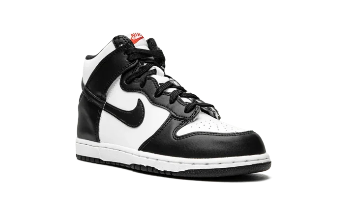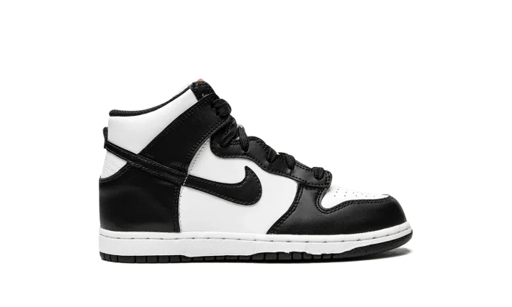 The Nike Dunk High PS "Panda" is the youth sizing of the black-and-white colorway of the popular high-top shoe. Based on the Dunk's original, two-tone design that honored some of the top college basketball teams in the country in 1985, the "Panda" is a versatile colorway that can be worn with a variety of casual outfits. The perforated toe, mid-panel, and collar are designed in white leather. Contrasting black leather panels on the toe cap, forefoot, eyelets, collar, heel, and Swoosh balance the look. The shoe's two-tone theme continues with black laces layered over a white nylon tongue. Red "Nike" and Swoosh branding appear on the white nylon tongue tag. A white midsole and black outsole finish the look.