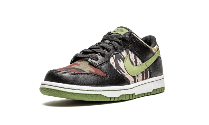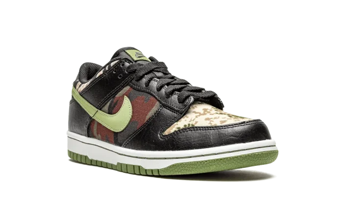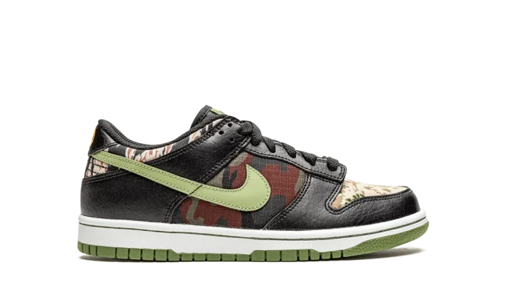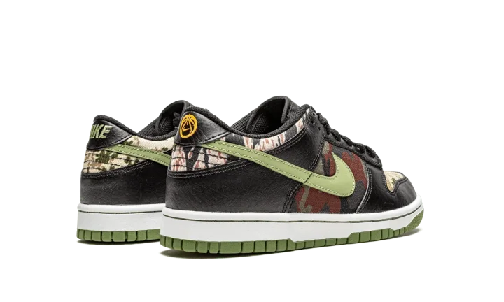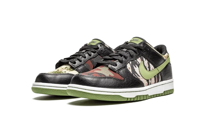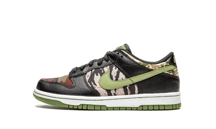 Nike Dunk Low GS "Black Multi-Camo" is the youth sizing of the retro basketball shoe in a mismatched color block that features multiple camouflage patterns. Inspired by 2000s streetwear aesthetics, the "Black Multi-Camo's design details include black leather on the forefoot, eyelets, collar, and heel. Contrasting camouflage prints appear on the canvas toe, mid-panel, collar, and heel. An olive green leather Swoosh is found on either side and green "Nike" branding is stitched onto the heel. An olive green tongue tag with "Nike" insignia is located on the black nylon tongue. Release date: August 18, 2021