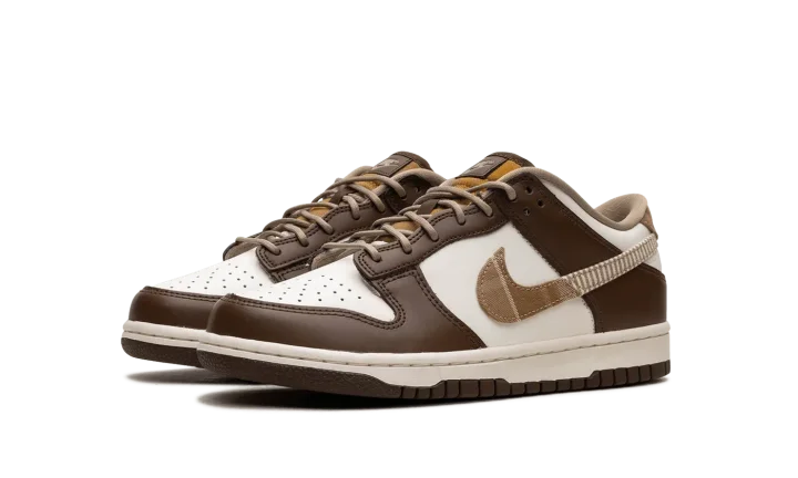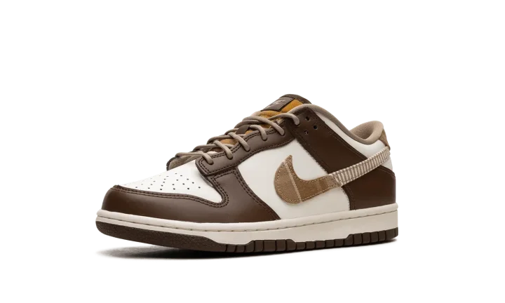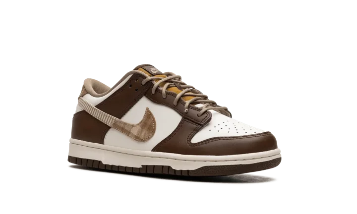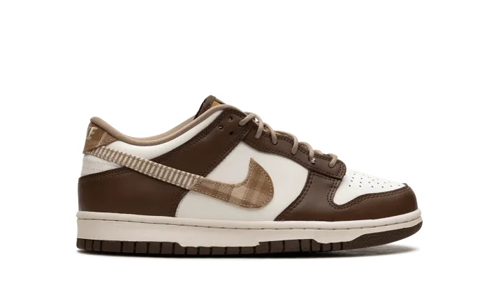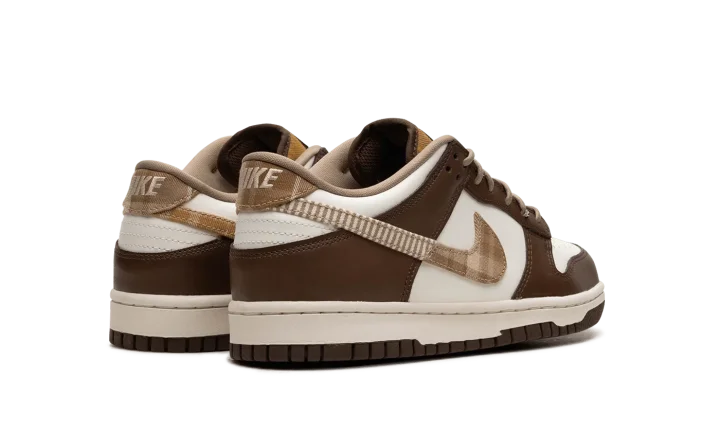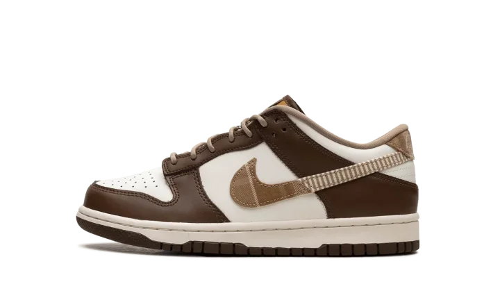 The Nike Dunk Low GS "Brown Plaid" is the youth sizing of the retro basketball shoe with a unique combination of materials in neutral colors. The upper features a Sail leather base with contrasting brown leather overlays on the toe, forefoot, eyelets, collar, and heel. A brown plaid material can be found on the Swoosh on either side of the shoe and on the heel tab. Classic "Nike" branding appears on the heel and tongue. The tongue is designed in a copper-colored corduroy material and outfitted with rope laces. Underfoot, a Sail rubber midsole gives the sneaker a vintage look. Release date: November 2023