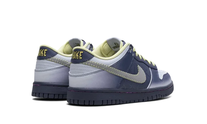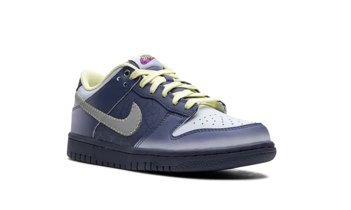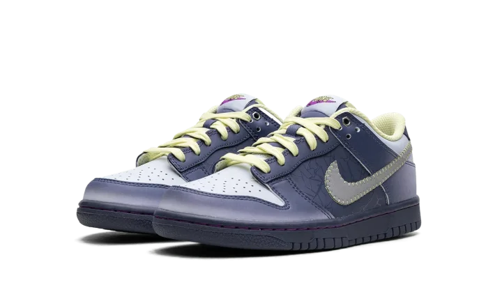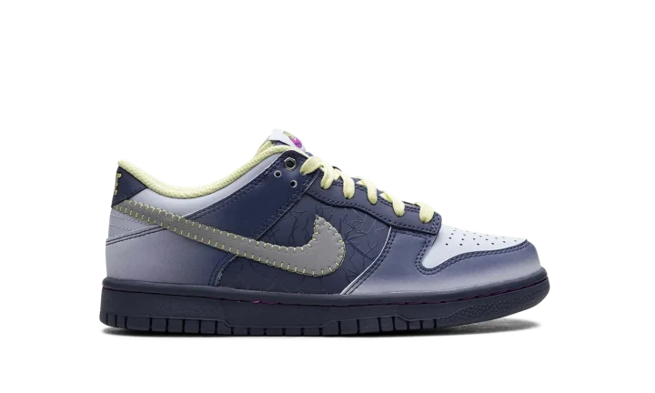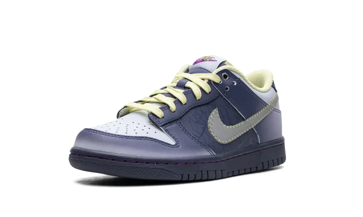 The Nike Dunk Low GS "Halloween" is the youth sizing of the retro basketball shoe in a colorway inspired by the spooky holiday. This Halloween-themed Dunk for 2023 features a white perforated leather toe with cracked grey leather on the mid-panel. Panels with grey gradients from light to dark add to the ghostly look. A grey leather Swoosh with thick yellow contrast stitching is seen on either side of the shoe. The phrase, "I AM FEARLESS!" is printed on the underside of the tongue. Release date: October 2023