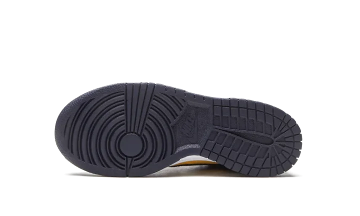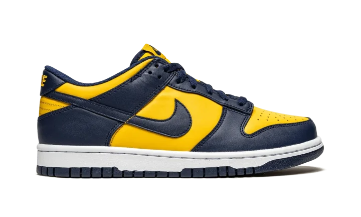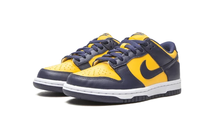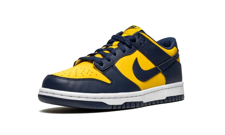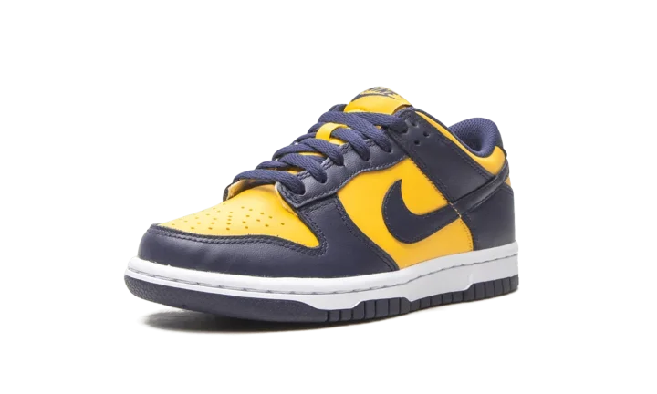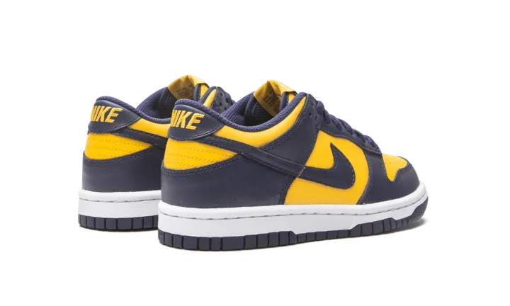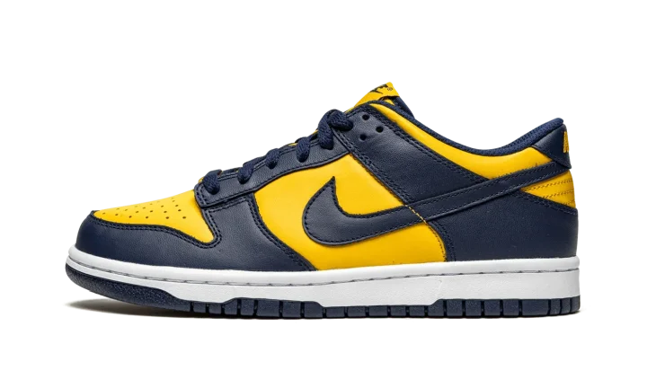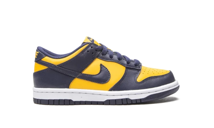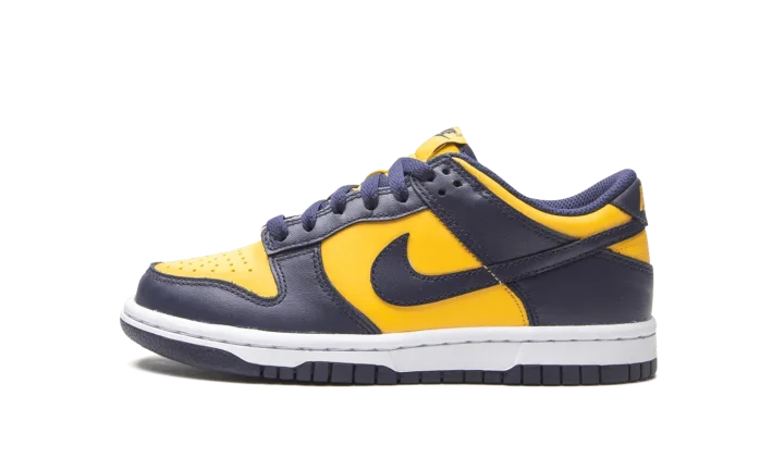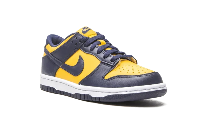 The Nike Dunk Low GS "Michigan" is the youth sizing of an original Dunk colorway that was originally produced for the Michigan Wolverines college basketball team in 1985. Debuting in 1985's "Be True to Your School" pack of college basketball inspired Dunks, the "Michigan" was brought back in high-top form by Nike to much fanfare in September 2020. The equally popular low-top edition follows the same color block as the original and high-top version of the "Michigan." Varsity Maize leather can be found on the perforated toe, mid-panel, collar, and heel. Contrasting Midnight Navy leather panels break up the look. A navy blue Swoosh is located on both sides and yellow "Nike" embroidery can be found on the heel. Blue shoe laces appear over the Varsity Maize nylon tongue. Release date: June 3, 2021