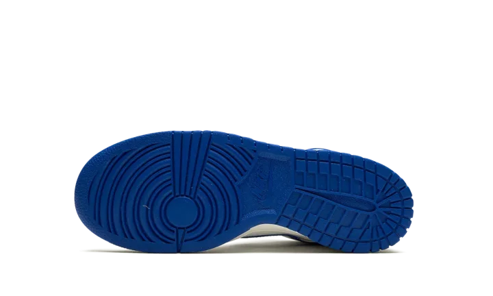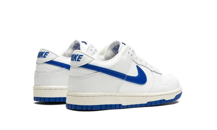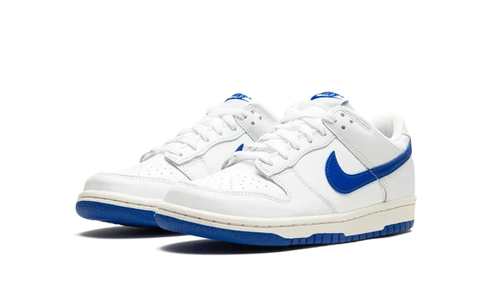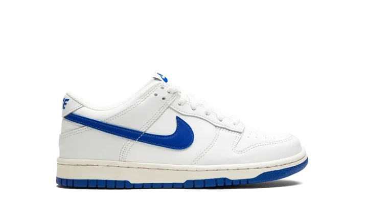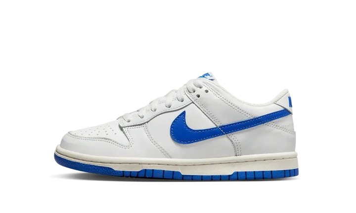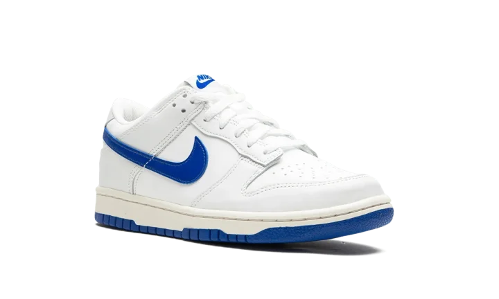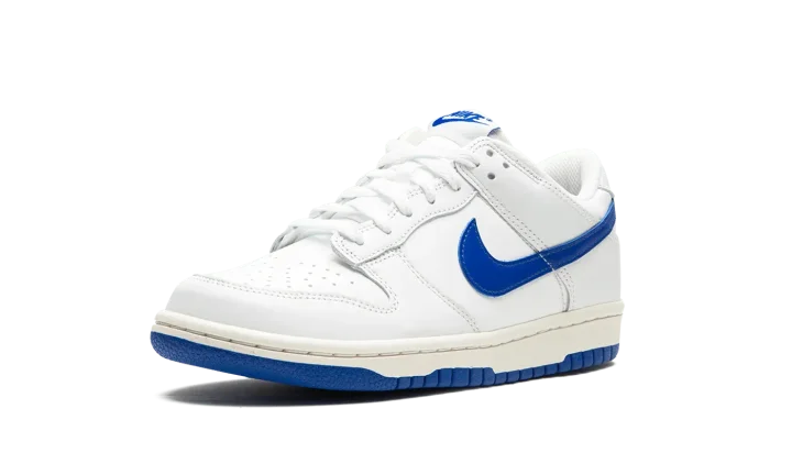 The Nike Dunk Low GS "White/Royal" is the youth sizing of the classic sneaker with a casual design. The colorway features a white leather upper with tonal leather overlay panels. A royal leather Swoosh is seen on the mid-panel. Royal "Nike" branding is embroidered on the heel and printed on the tongue tag alongside a royal-colored Swoosh. An aged rubber midsole and royal rubber outsole complete the look.