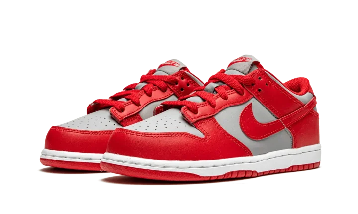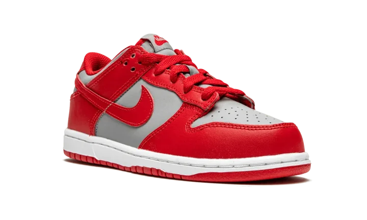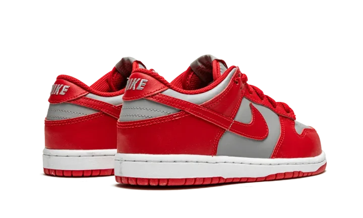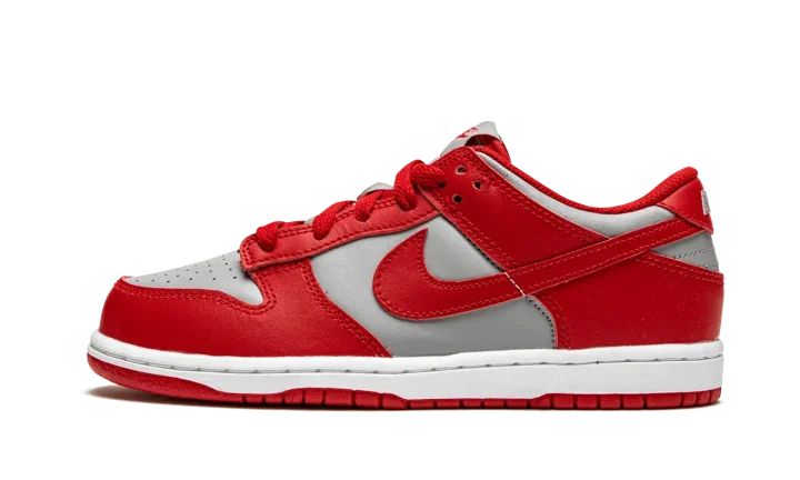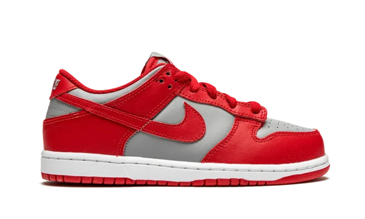 The Nike Dunk Low PS "UNLV" is the preschool sizing of an original colorway of the former performance basketball shoe that debuted in 1985 as part of the "Be True to Your School" pack. The "UNLV" Dunk was designed for the UNLV Runnin' Rebels basketball team during Nike's expansion into the college basketball ranks back in the mid-80s. In 2020 and 2021, Nike re-issued several iconic styles from the "Be True to Your School" collection, including the "Syracuse" and "Michigan" Dunks, in efforts to create excitement around the retro silhouette. To say Nike succeeded in doing so would be an understatement. Here, Varsity Red leather panels on the forefoot, eyelets, collar, and heel are laid over a Medium Grey leather base. A red leather Swoosh resides on either side and grey "Nike" embroidered is stitched onto the heel. Red "Nike" branding appears on the grey nylon tongue tag and a white midsole and red outsole are consistent with the original design of the Nike Dunk Low "UNLV."