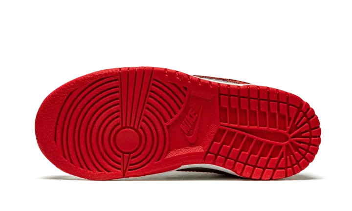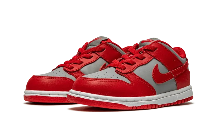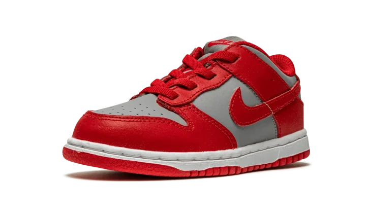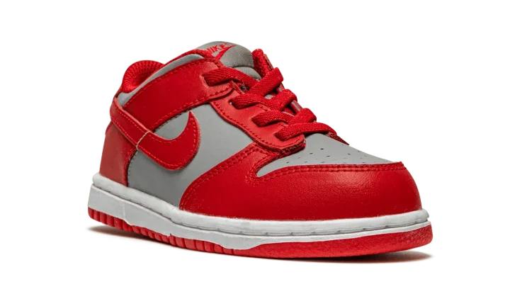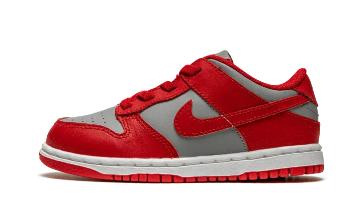 The Nike Dunk Low TD "UNLV" is the toddler sizing of an original colorway from Nike's 1985 "Be True to Your School" collection dedicated to the country's elite college basketball programs. The "UNLV" joins the "Syracuse" and "Michigan" colorways, among others, in fueling the Dunk's improbable comeback into mainstream consciousness. Like the original style, the modern "UNLV" features Varsity Red leather panels and Swoosh branding layered over a Medium Grey base. The laces and "Nike" detailing on the grey mesh tongue also display the same fiery shade of red. On the back, embroidered "Nike" branding in grey lettering adds a nostalgic vibe. A white midsole and red outsole combine to round out the look of this popular Dunk shoe.