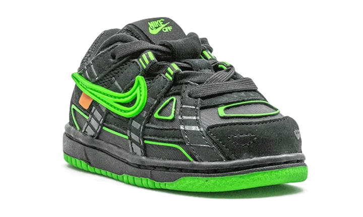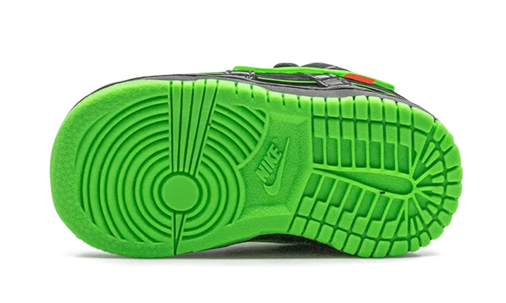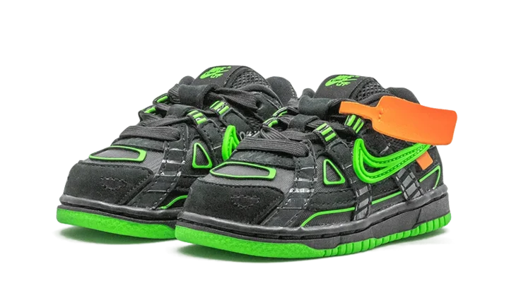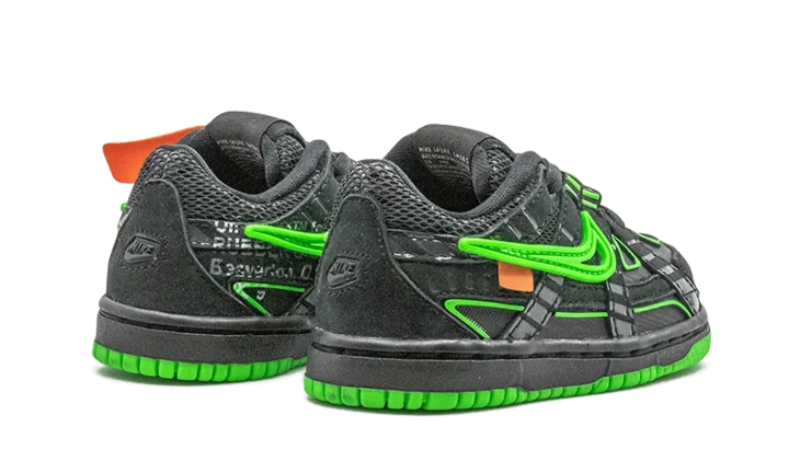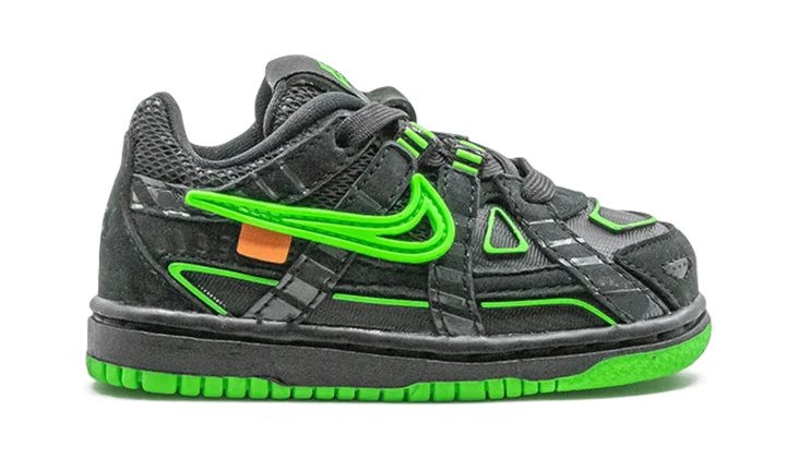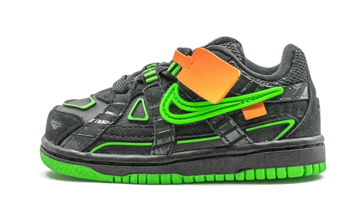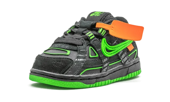 The Off-White x Nike Air Rubber Dunk TD "Green Strike" is the toddler sizing of the design that draws inspiration from the Nike SB Dunk and P-6000. Another ingenious creation by Virgil Abloh, the Rubber Dunk is a contemporary rendition of the Dunk model that adds elements of Nike's performance heritage. The upper is reminiscent of the Dunk in shape, and adds layers and textures derived from the P-6000. A green rubber outline Swoosh is overlaid across the vertical black suede panels that can be found on top of the tonal mesh base. Additional green piping can be found on the toe, forefoot, and above the black rubber midsole. The toddler sizing variant of the Rubber Dunk receives the same orange hang tag as its adult sized counterpart. Release date: October 1, 2020.