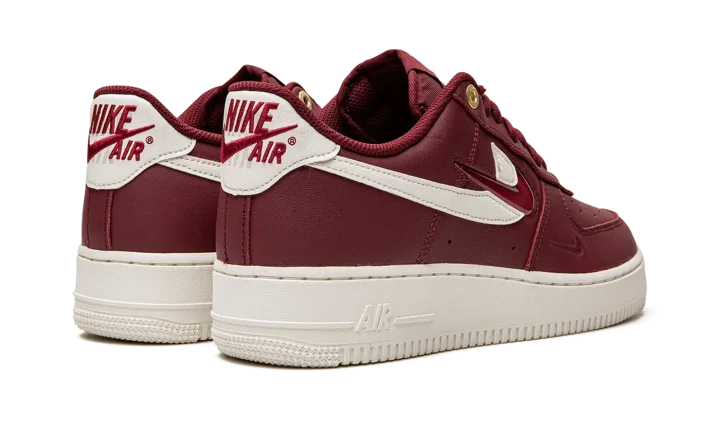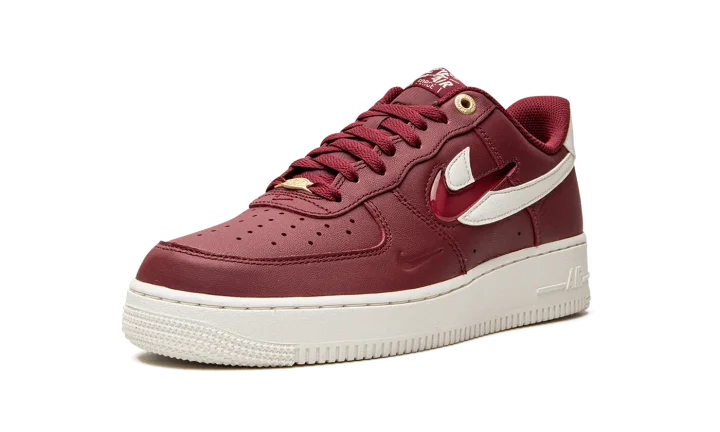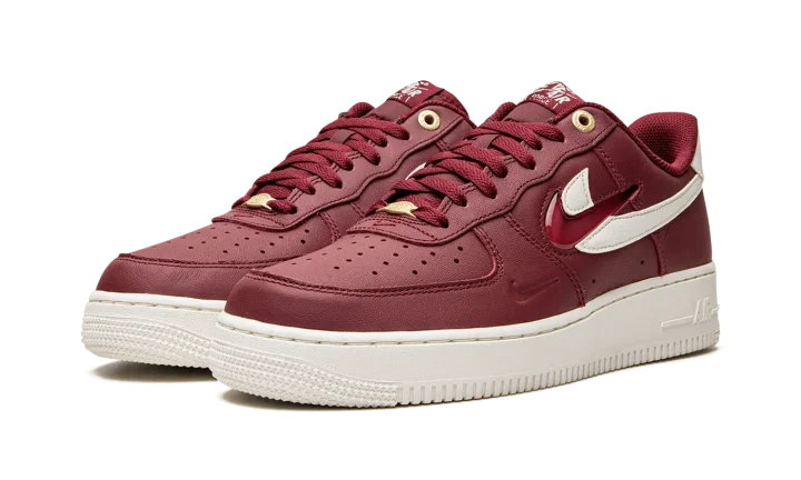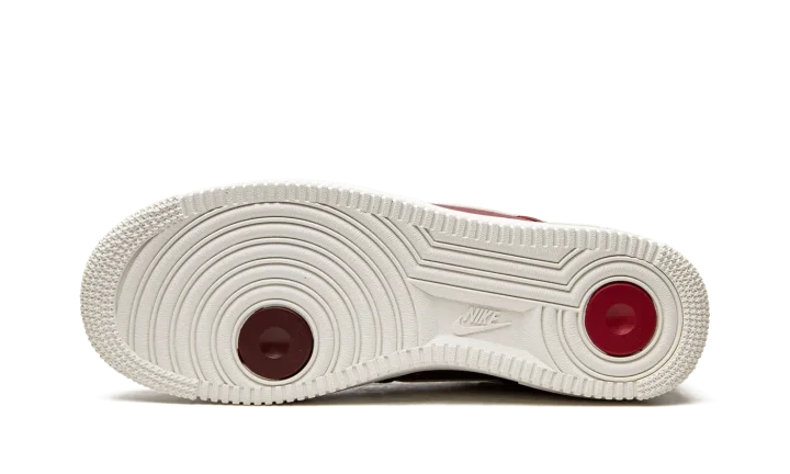 The Nike Air Force 1 Low "Join Forces - Team Red" is a unique colorway of the retro basketball shoe with dual Swooshes on its design. Celebrating the Air Force 1's 40th anniversary, the "Join Forces - Team Red" colorway is complete with a Team Red leather construction with a tonal jeweled Swoosh layered over a Sail leather Swoosh. Red "Nike Air" branding in an old school style design is embroidered over grey "Nike Air" detailing on the Sail leather heel tab. A small Swoosh is debossed on the lateral side of the forefoot overlay. Underfoot, a Sail-colored rubber midsole with tonal "Air" branding completes the look.