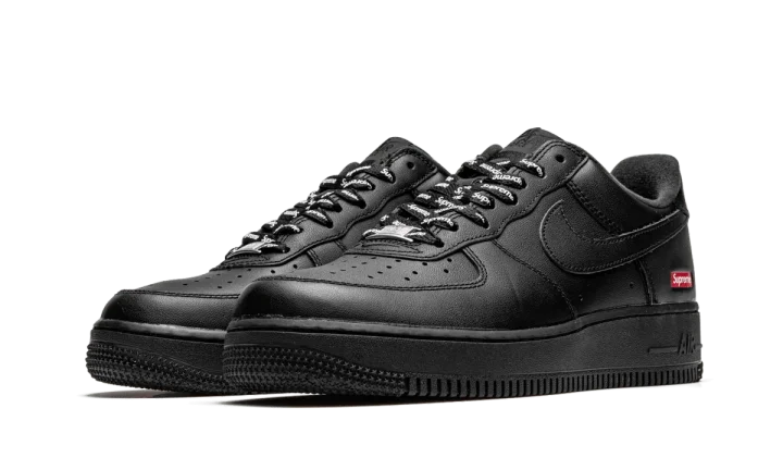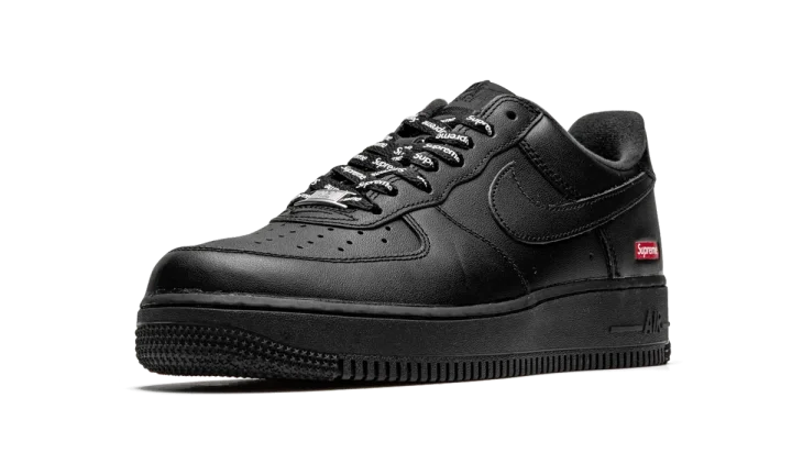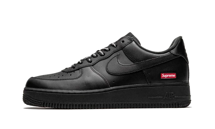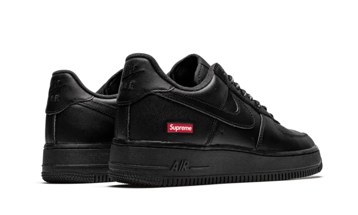The Supreme x Nike Air Force 1 Low "Box Logo - Black" is a Spring 2020 release that features minimal branding for a clean aesthetic. Joining a crisp all-white colorway, the black-based look features a smooth leather upper with a mini red Supreme Box Logo printed on the heel. A gold-accented "AF1" emblem covers the bottom of the laces near the perforated toe. Tonal Nike Air branding covers the tongue tab and heel to finish off the look. Each pair also comes with a set of Supreme-branded shoe laces. Release date: March 5, 2020.