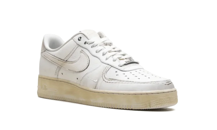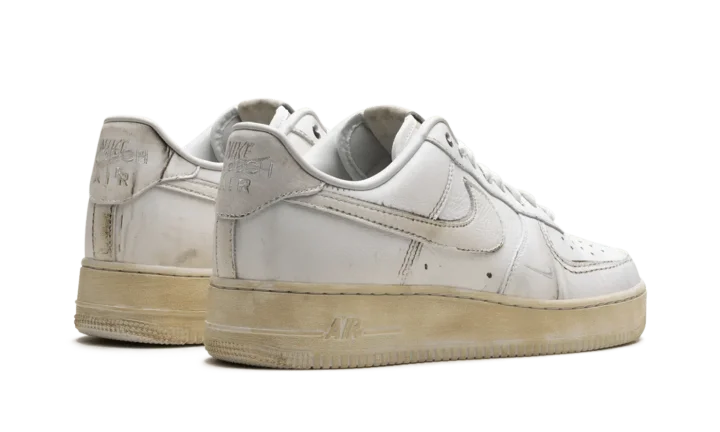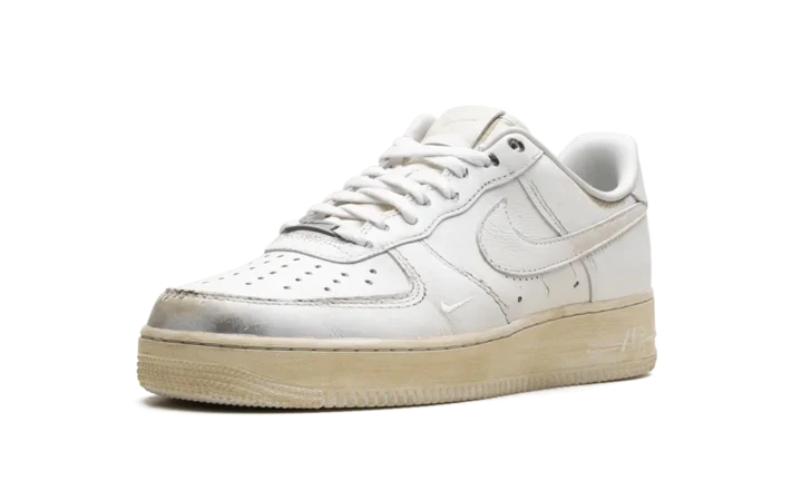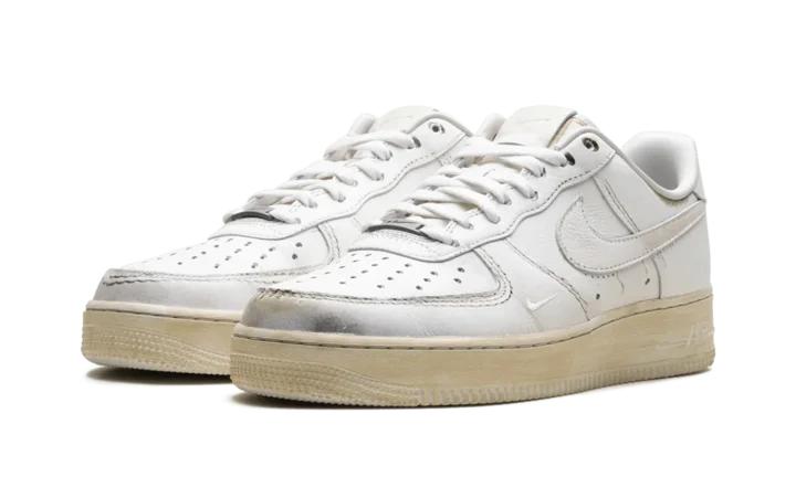 The Nike Air Force 1 Low .SWOOSH 'Dirty Triple White' flips the iconic fresh white aesthetic on its head, arriving pre-worn and "dirty" straight out of the box. This conceptual sneaker, part of the exclusive .SWOOSH line, is a commentary on the life cycle of the classic AF1.