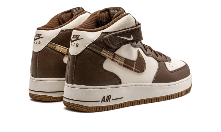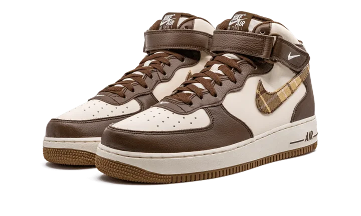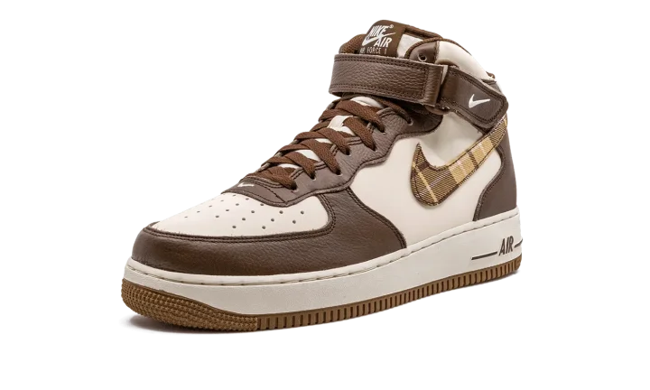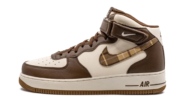 The Nike Air Force 1 Mid "Brown Plaid" is a colorway of the classic sneaker with a brown-based plaid pattern on its design. The Air Force 1 Low honored its 40th anniversary in 2022 in spectacular fashion with hyped collaborations and popular colorways. The "Brown Plaid" continues the shoe's strong run. The upper is complete with a cream-colored leather appearance that is contrasted with brown leather overlay panels. A brown plaid pattern is found on the Swoosh on either side. Classic "Nike Air" and "Air Force 1" branding appears on the heel and tongue, respectively. Release date: December 1, 2022