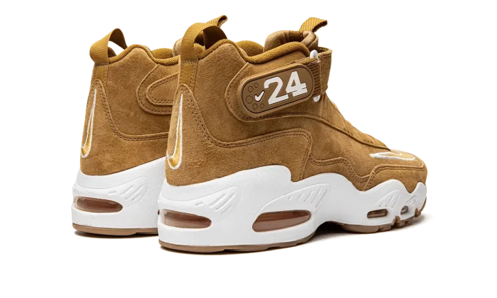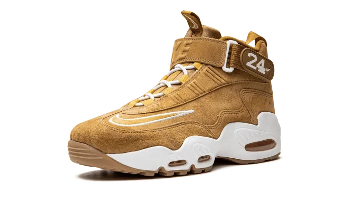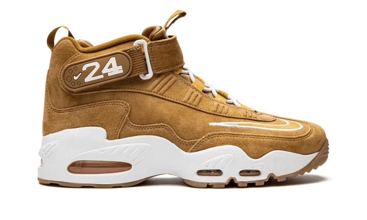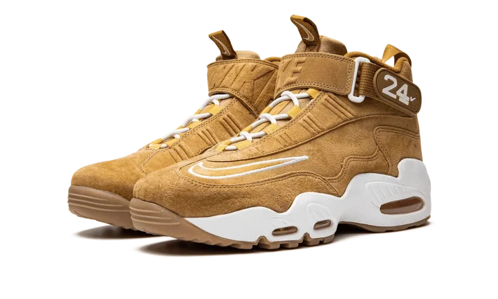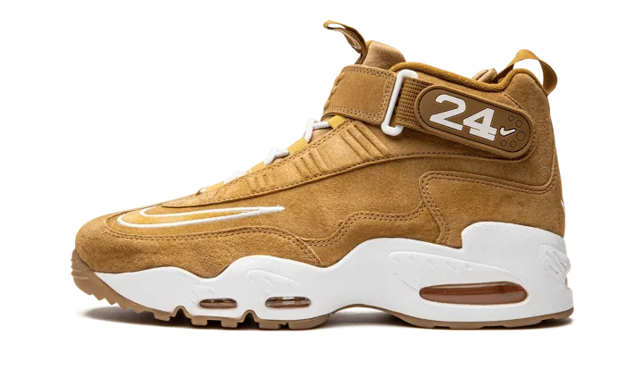 The Nike Air Griffey Max "Wheat" is an autumn-inspired colorway of Ken Griffey Jr.'s former signature shoe. Nike's beloved "Wheat" theme has appeared on countless releases over the years, and it finds its way on the Air Griffey Max a year after the retro performance shoe celebrated its 25th anniversary. This release features a Wheat-colored suede upper with a contrasting white outline Swoosh on the forefoot. Griffey's "24" jersey number with the Seattle Mariners appears on the side of the adjustable ankle strap and tonal "Nike" branding is debossed on the front of the strap.