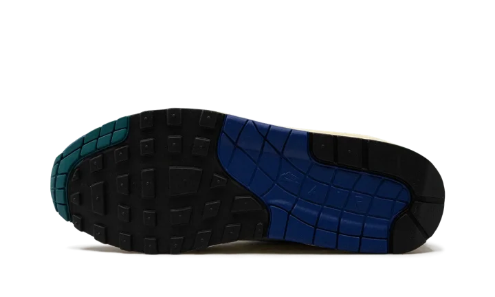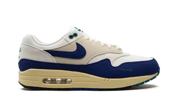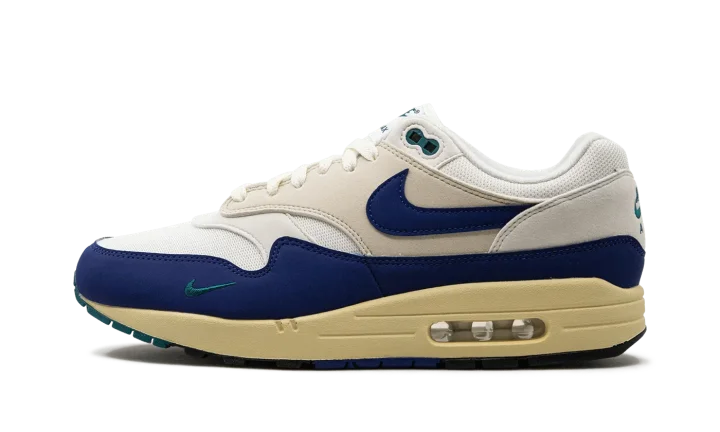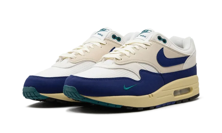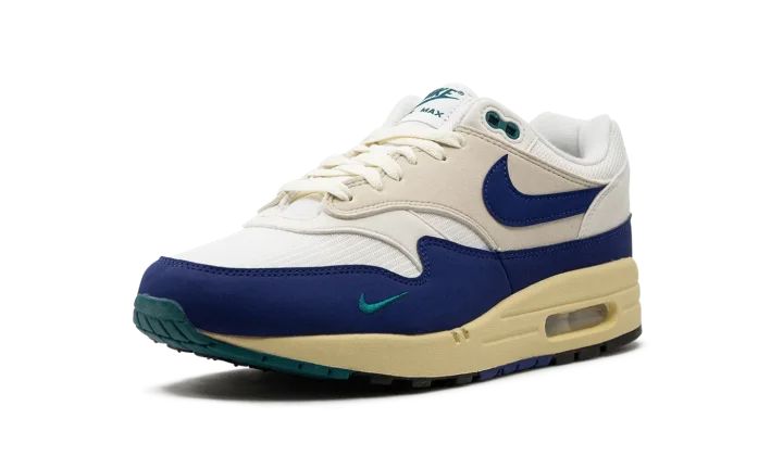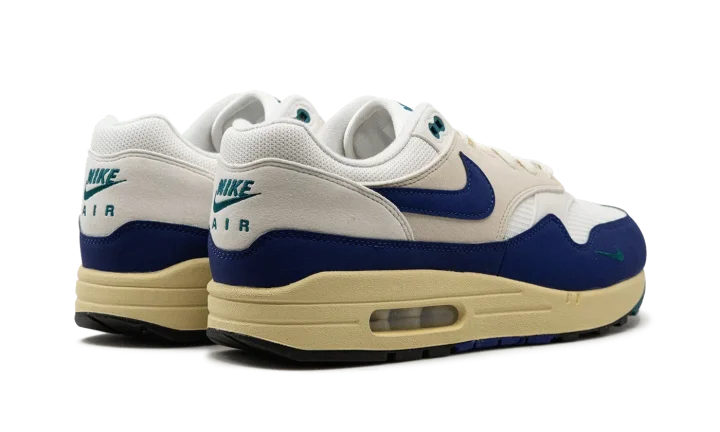 The Nike Air Max 1 "Athletic Department - Deep Royal Blue" is a colorway of the retro sneaker with a decidedly vintage design. The upper has a white textile base with a light tan felt overlay on the mid-panel. A Deep Royal Blue synthetic nubuck mudguard and Swoosh add a pop of color to the shoe's design. Fir-colored Swoosh branding is embroidered on the lateral side of the forefoot, and Fir "Nike Air" branding is embroidered on the heel. Underfoot is an aged-looking cream white foam midsole that ties into the Air Max 1's old school vibe.