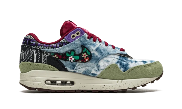 The Concepts x Nike Air Max 1 "Mellow" is a collaboration between the Boston based sneaker boutique and Nike on the vintage running shoe in a colorway inspired by 1960s and 1970s youth culture. The "Mellow" colorway draws favorably from the era's music festivals, specifically the '69 Harlem Cultural Festival, which was headlined by the likes of Stevie Wonder, Nina Simone, and many more. The unique fashion worn by the festival's headlining acts and concert goers informs the eye-catching bandana, cowhide, denim, and woven materials found on the "Mellow's" design. Velvet accenting, frayed edges, and a multicolor Swoosh accentuate the shoe's "flower power" design ethos. Release date: March 5, 2022