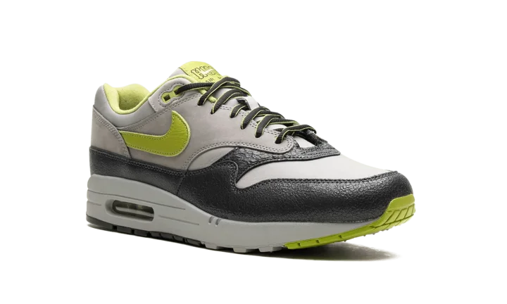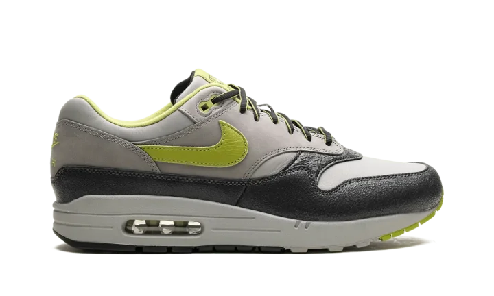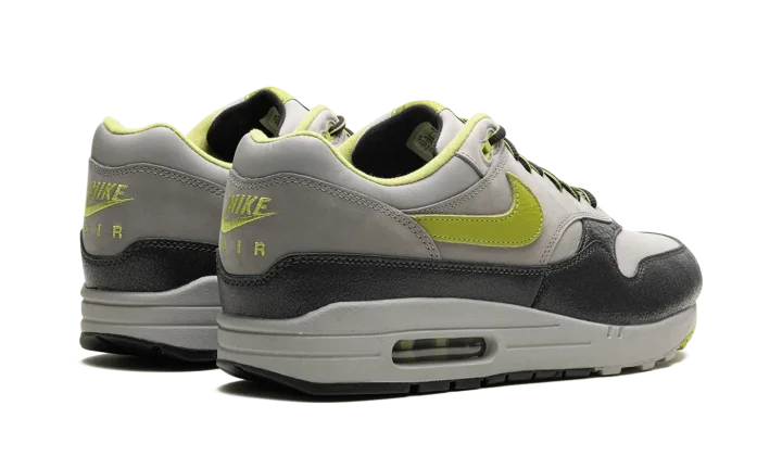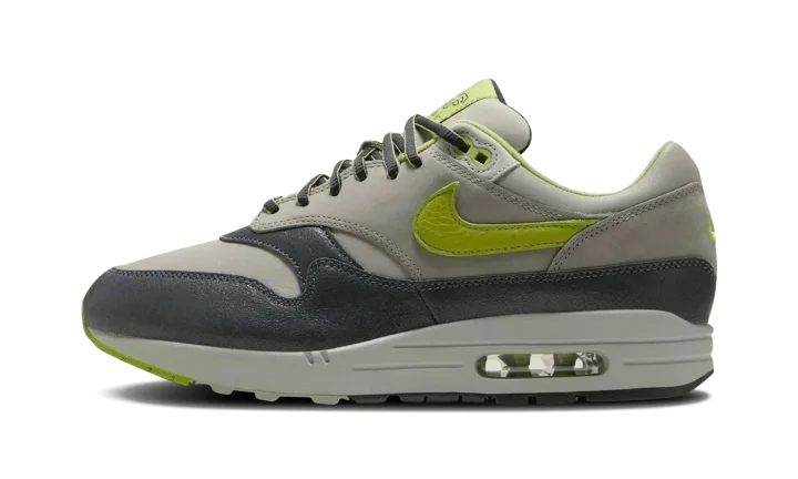 The HUF x Nike Air Max 1 SP "Pear" is a collaboration between the San Francisco based skate brand and Nike on the retro running shoe. From a three-piece collection, the "Pear" celebrates the 20th anniversary of the brand's first project released in 2004. Moreover, the pack is inspired by an unreleased sample Air Max 1 by HUF. Here, the upper features a grey nubuck construction with Anthracite-colored cracked leather on the forefoot overlay and mudguard. Pear accenting can be found on the leather Swoosh, "Nike Air" branding on the heel, the co-branding on the tongue tag, and inner lining. Two-tone black-and-green laces complete the look. Release date: June 15, 2024