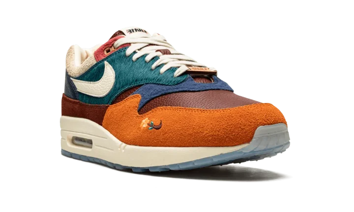 The Kasina x Nike Air Max 1 "Wong Ang - Orange" is a collaboration between the South Korean based brand and Nike on a collection of colorways of the retro running shoe inspired by Wong Ang—which means the unity of people in the Korean language. The two-shoe pack tells the story of the traditional Korean custom that involves Wong Ang Ducks, a set of carved wooden ducks given to newlywed couples. The shoe's design is complete with a combination of materials in orange, burgundy, blue, and teal on the upper. Specifically, a teal faux pony hair textile can be found on the eyelet panel and mid-panel. The mudguard is constructed in a split orange and burgundy hairy suede on the toe and forefoot, and on the heel, respectively. The hues of green and blue on the shoe's upper evoke the duck's natural surroundings. Overall, the colors and materials used on the "Wong Ang" Air Max 1 by Kasina are a tribute to traditional Korean culture. Release date: June 8, 2022