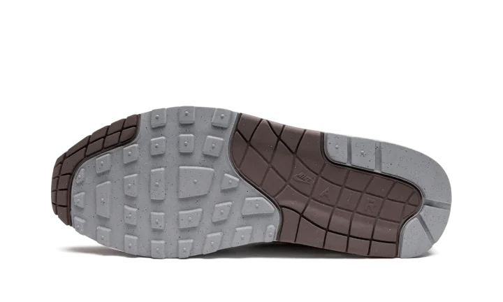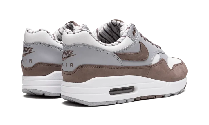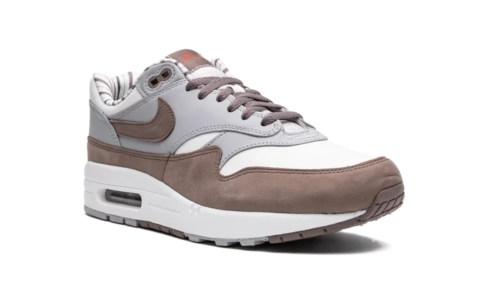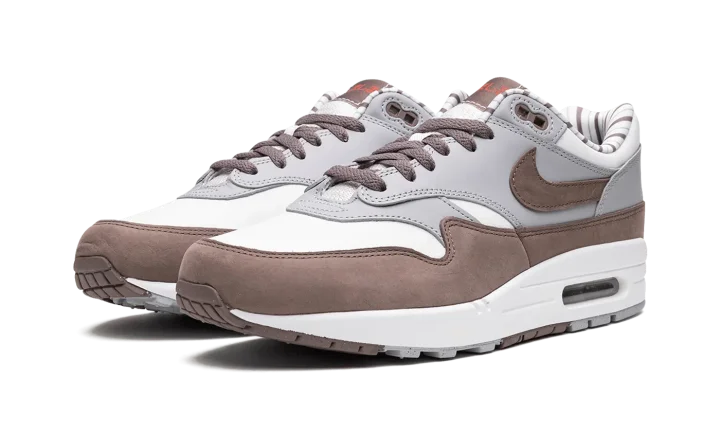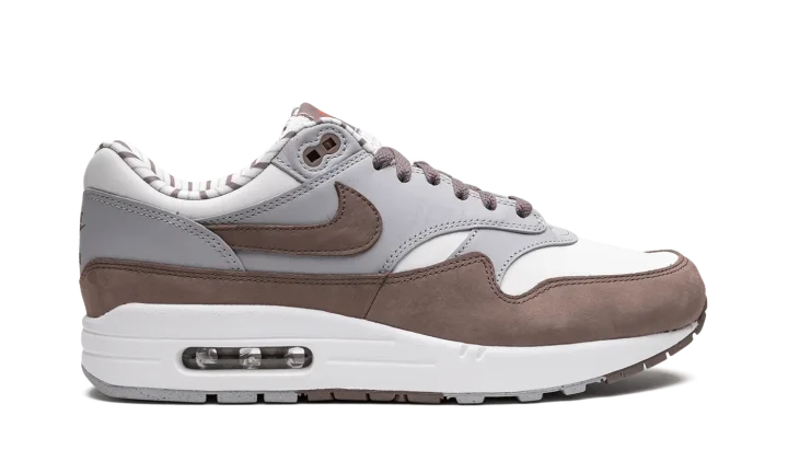 The Nike Air Max 1 "Shima Shima" is an easy-wearing colorway of the retro performance running shoe that features neutral colors on its design. The "Shima Shima" Air Max 1 was originally released by Nike in 2003 before it was reissued in 2023. The colorway features a white textile base with contrasting grey synthetic leather overlays. A brown Swoosh matches the brown mudguard. Unique red Japanese characters are printed on the brown tongue tag. Classic "Nike Air" and Swoosh detailing is embroidered on the heel. The interior collar is finished with white and brown stripes.