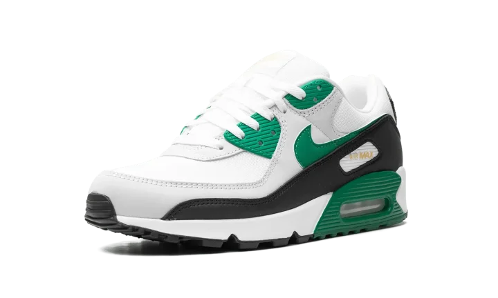 The Nike Air Max 90 "Malachite" is a colorway of the retro running shoe with green, black, and gold accents. The upper features a white mesh base layer contrasted with a light grey synthetic nubuck panel on the midfoot, and a black leather mudguard. A Malachite-colored Swoosh can be found on both sides of the shoe, while an "Air Max" branding window appears on the lateral side of the quarter panel, and classic "Nike Air" detailing is seen on the heel. Moreover, additional branding appears in the form of the "Air Max" detailing on the tongue tag. A Malachite panel surrounds the visible Air unit in the heel of the midsole. Release date: December 26, 2023