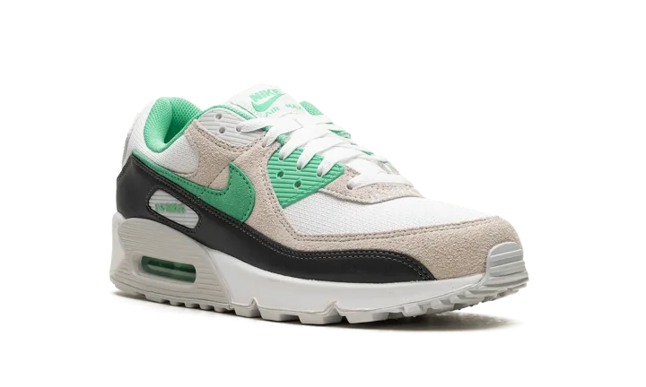The Nike Air Max 90 "Spring Green" is a clean and classic colorway of the retro performance running shoe with green accents. The "Spring Green" is designed in a similar color block to that of the Air Max 90's iconic "Infrared" colorway, one of the greatest looks for the shoe ever. More specifically, the "Spring Green" is complete with a white mesh base with tan suede overlays. A Spring Green suede Swoosh can be found on either side of the shoe. More Spring Green accenting lands on the eyelet panels, on the "Air Max" branding window on the lateral side of the shoe, and on the "Nike Air" logo on the heel. Underfoot, a translucent panel surrounds the Air bubble in the heel of the white foam midsole. Release date: March 27, 2023