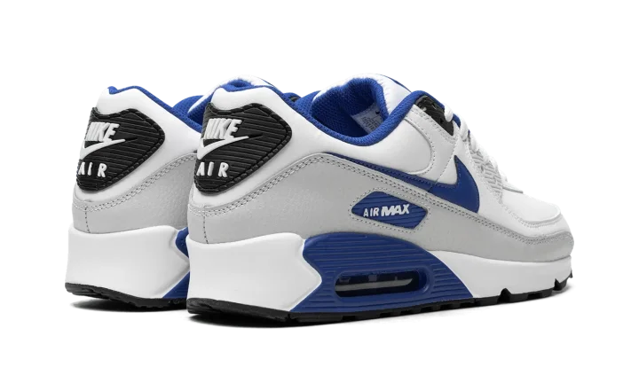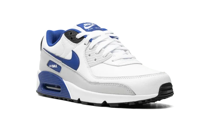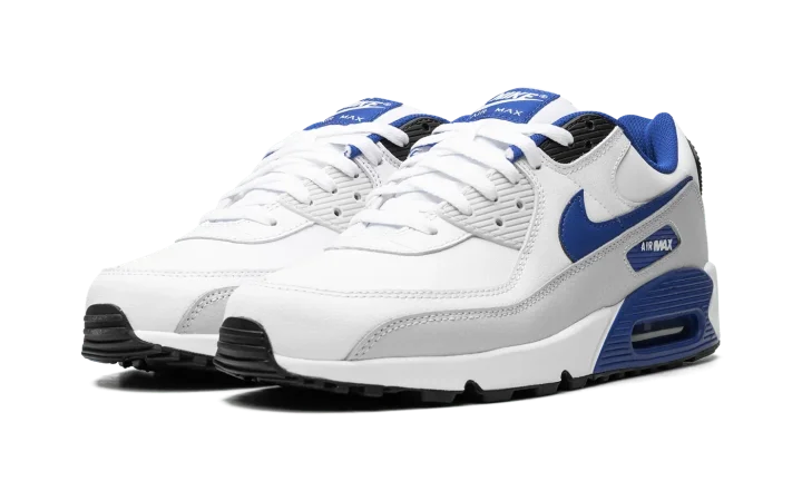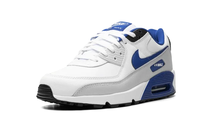The Nike Air Max 90 Leather "White/Game Royal" is a sporty-looking colorway of the retro performance running and lifestyle shoe. The Air Max 90 was designed by Tinker Hatfield and released by Nike in 1990, and today stands as one of the most iconic Nike running shoes ever. On this "White/Game Royal" colorway, the shoe features a white leather base and a Photon Dust tumbled leather mudguard. White leather is seen on the overlay on the mid-panel while a Game Royal leather Swoosh is located on either side of the sneaker. Additional Game Royal detailing is found on the "Air Max" branding window on the lateral side of the heel. Classic "Nike Air" detailing appears on the heel and "Nike Air Max" branding is found on the royal blue tongue tag. A Game Royal panel surrounds the visible Air unit in the heel of the midsole. Release date: August 3, 2023