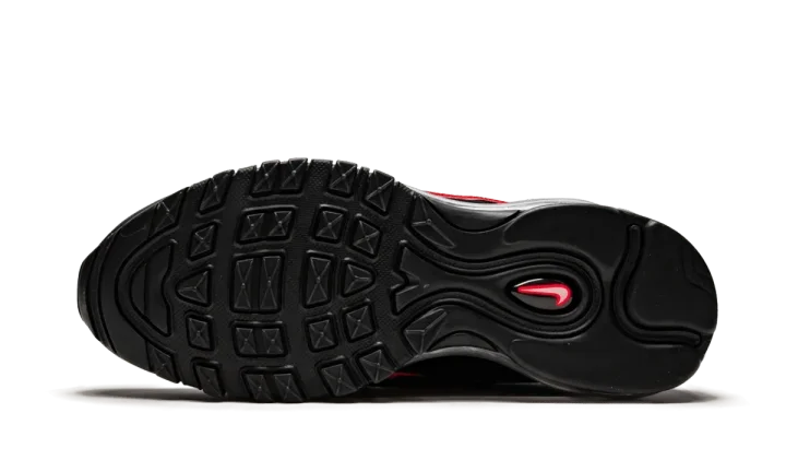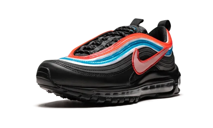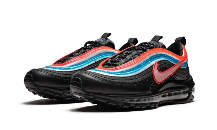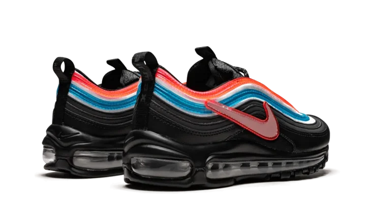 The Nike Air Max 97 "Seoul - On Air" is one of the winning designs from Nike's "On Air" collection of Air Max models. In 2018, Nike invited locals from Seoul, New York City, London, Paris, Tokyo, and Shanghai to design their own colorways on an Air Max model of their choosing. Eighteen finalists were then voted on by the public, with one winner selected from each city. Gwang Shin represented Seoul, South Korea with this Air Max 97. The unique colorway and construction is inspired by the city's large neon signs, the contrasting colors of the South Korean flag, and the flag's Taegeuk symbol that represents universal balance. The predominantly black panels of the upper represent the night sky in Seoul, with the translucent red and blue stripes and oversized Swoosh mimicking the look of neon signs. The Nike Air Max 97 "Seoul" from the On Air collection released on April 13, 2019.