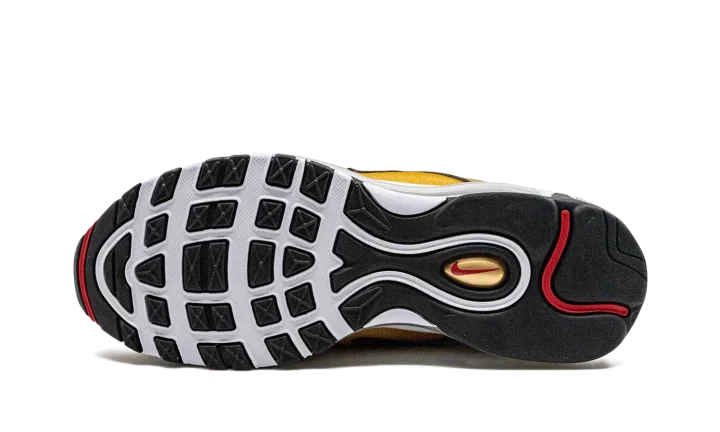 The Nike Air Max 97 "Gold Bullet" is a popular colorway of the retro performance running shoe that channels the vibe of the model's "Silver Bullet" release. Like the "Silver Bullet," the Air Max 97's "Gold Bullet" colorway has an unmistakable design that draws attention everywhere it goes. The shoe's base is featured in Metallic Gold, as are the wavy leather overlays that wrap around the shoe. A small University Red Swoosh appears on either side above the white foam midsole. The logo is also found on the circular black overlay on the tongue. Red "Air Max" detailing is printed on the heel tab. A full-length Max Air cushioning unit in the midsole completes the design.