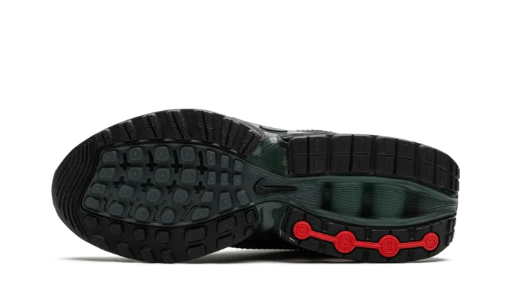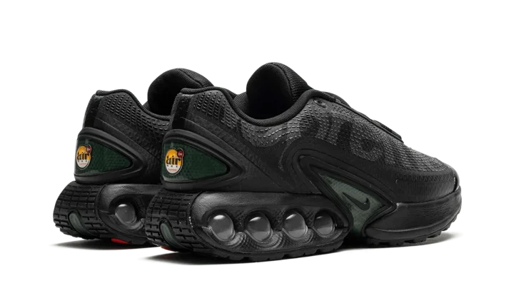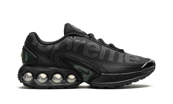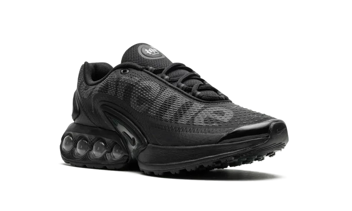 The Supreme x Nike Air Max Dn "Black" is a collaboration between Supreme and Nike on the lifestyle shoe that debuted in 2024. The Air Max Dn was introduced by Nike as part of its celebration for its annual Air Max Day in March 2024. It was also included in the high-profile collaboration with Supreme for the brand's Spring/Summer 2024 collection. As far as the design of the shoe at hand, it features a seamless black mesh construction with tonal no-sew overlays. "Supreme" branding is printed on the lateral side in reflective lettering, while a co-branded logo can be found on the tongue and heel. Underfoot, a green-tinted TPU shank plate can be seen in the midsole, while exposed dual-pressure "tubes" filled with Nike's Dynamic Air cushioning technology appear in the heel with "Supreme" branding printed on the lateral side. Release date: February 22, 2024