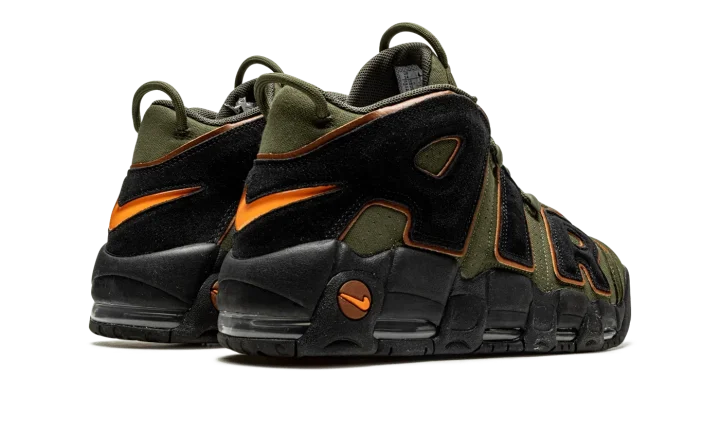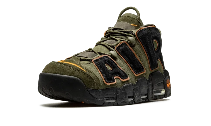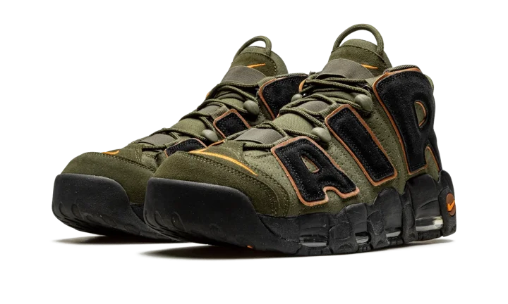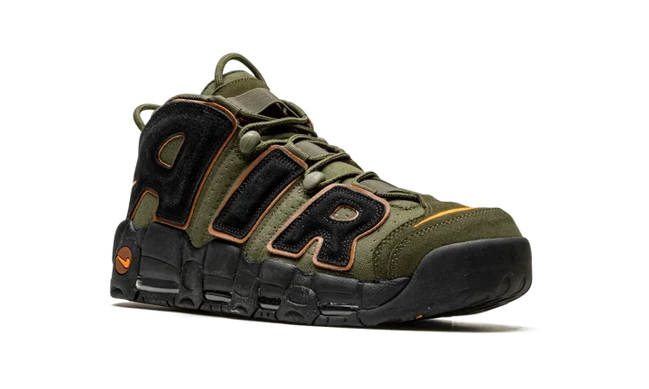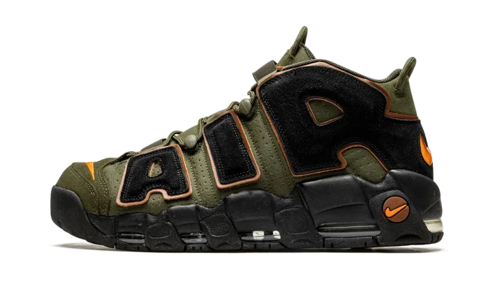 The Nike Air More Uptempo "Cargo Khaki" is an earth tone colorway of Scottie Pippen's former signature shoe. The Air More Uptempo debuted back in 1996 is was worn by Pippen with the Chicago Bulls during the team's historic 1995-96 season in the NBA. On the "Cargo Khaki," the shoe receives a makeover that includes olive green-colored leather on its base and black suede oversized "AIR" branding on either side. An orange Swoosh logo is embroidered on the toe and a Jeweled Swoosh appears on the heel. Two olive green pull loops, one on the tongue and the other on the heel, assist with easy on/off wearability. Visible Air cushioning is found in the black rubber midsole. Release date: September 14, 2022