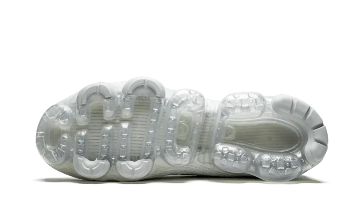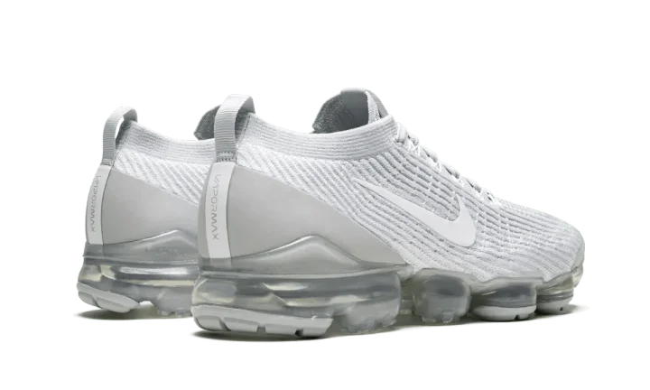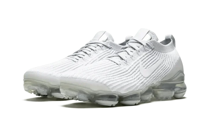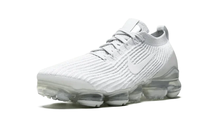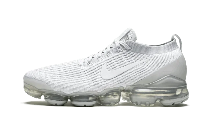 The Nike Air Vapormax Flyknit 3 "Pure Platinum" is a predominantly white monochromatic look for the casual lifestyle silhouette. Two of Nike's premier design technologies, Flyknit and Vapormax, are present on this ultra comfortable sock-like shoe. The brand's Flyknit material is cast in white on the upper and provides both a breathable and supportive fit to the wearer. A low-contrast Pure Platinum heat-welded heel counter and white Swoosh on either side continue the model's minimalist appearance. Underfoot, futuristic Air bubbles provide a springy and responsive ride for all-day comfort.
