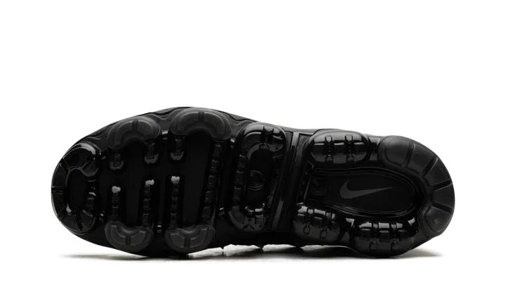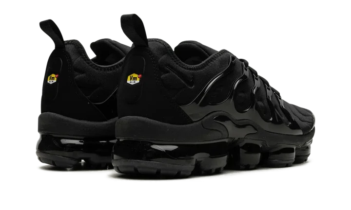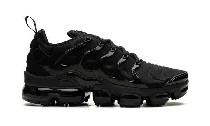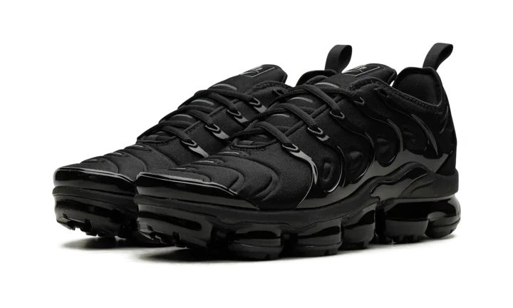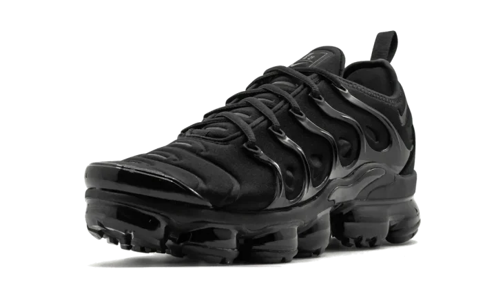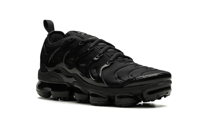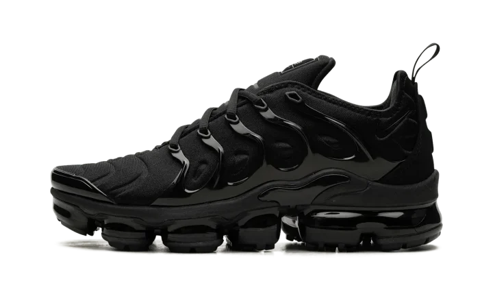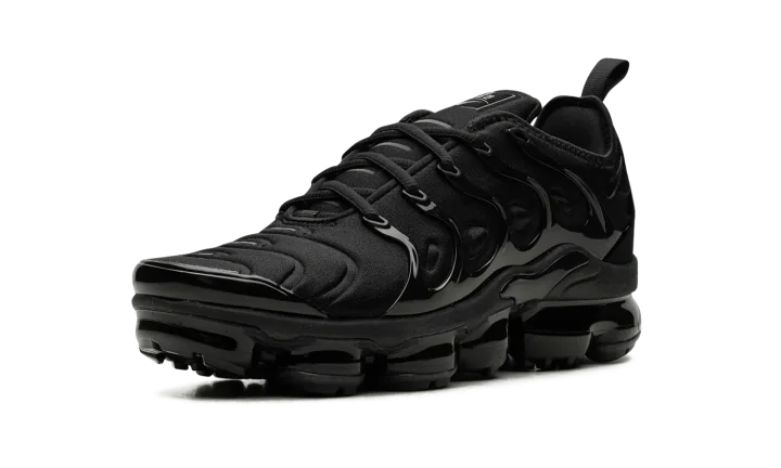 The Nike Air VaporMax Plus "Triple Black" originally released in 2018. It is a fusion model that combine Nike's futuristic VaporMax cushioning system with the design DNA of the popular Nike Air Max Plus. A neoprene upper sporting similar details to the 1998 runner is accented by reflective tabs running up the tongue. A black TPU lacing cage has been added to resemble the represent the overlays on the original Air Max Plus. Special "Vm Air" logos don each heel and insole as a nod to the yellow Tuned Air branding of the OG. Additional branding is kept to a minimum with a small Swoosh stamped on the lateral heel and tonal tongue logo. The Nike Air VaporMax Plus "Triple Black" sits atop a blacked-out VaporMax bubble to complete the stealthy design.