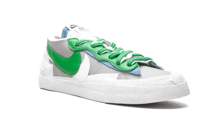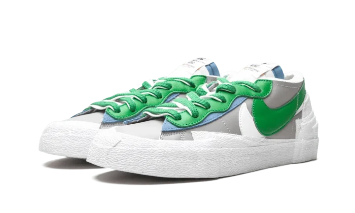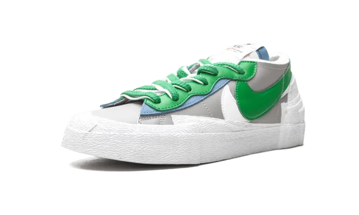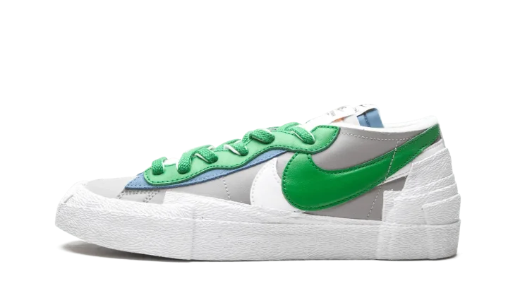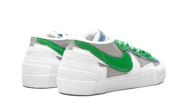 The sacai x Nike Blazer Low "Classic Green" is a Spring 2021 release that follows the high fashion brand's original collaboration with Nike on the Blazer Mid from 2019. Like all of its partnerships with Nike, sacai's Blazer Low in the "Classic Green" colorway continues to play with proportions by applying "two" of every design element, including two leather Swooshes in white and Classic Green on both sides of the light grey leather base. Dual laces, one white, one green, can be found layered over a stacked white and light blue nylon tongue with dual "Nike" branded tongue tags. Sacai continues the "two" theme on the eyelets by layering a green leather panel over a light blue leather panel. Four stacked white rubber panels extend from the white vulcanized midsole to cover the lower area of the heel for an abstract look. Release date: Summer 2021