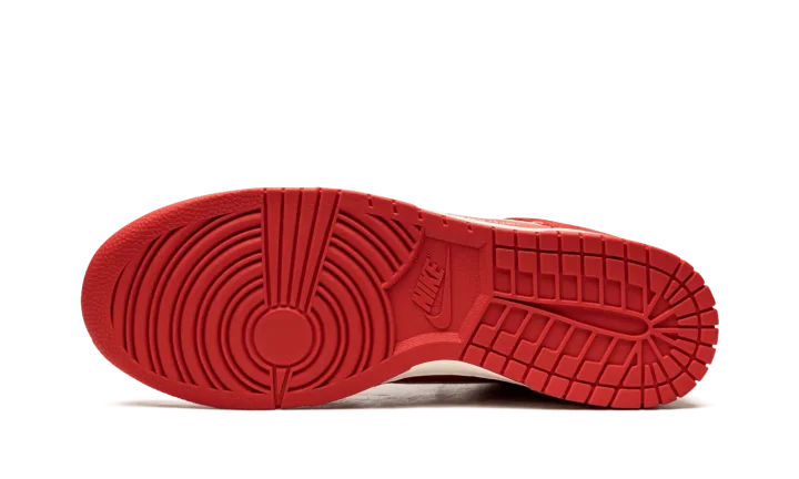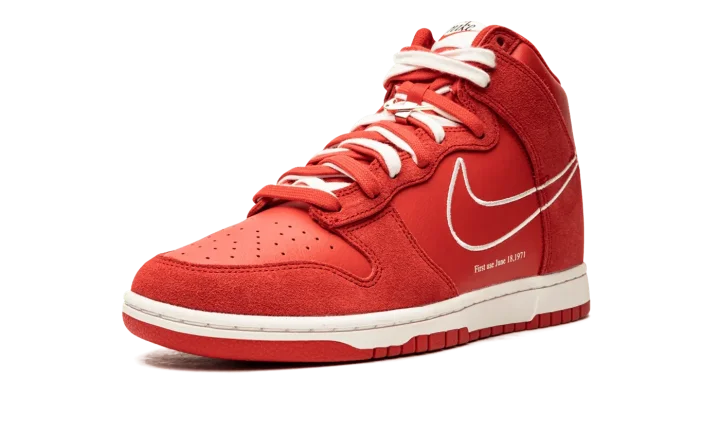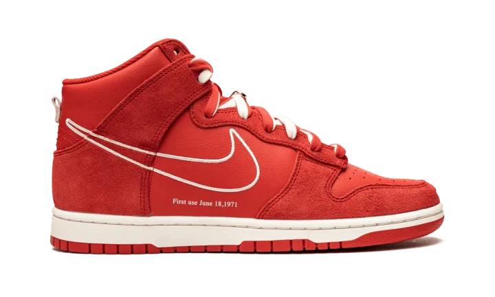 The Nike Dunk High SE "First Use - University Red" is a June 2021 release by Nike that honors the brand's iconic Swoosh logo with unique branding. The "First Use" references the famous Nike logo with special "First Use June 18, 1971" text below a white outline Swoosh on either side. "1971" detailing can be found on the insoles and an old school black "Nike" logo with an orange Swoosh appears on the white nylon tongue tag. White and University Red laces are layered over the red tongue. The double-lace look mimics the design of high fashion house sacai's collaborations with Nike on the LDWaffle, Blazer, and Vapor Waffle. The upper features a predominately monochromatic red construction with University Red leather appearing on the perforated toe, mid-panel, and collar. Tonal red suede can be found on the forefoot, collar, and heel. The cream rubber midsole gives the "First Use - University Red" a vintage look. Release date: June 18, 2021