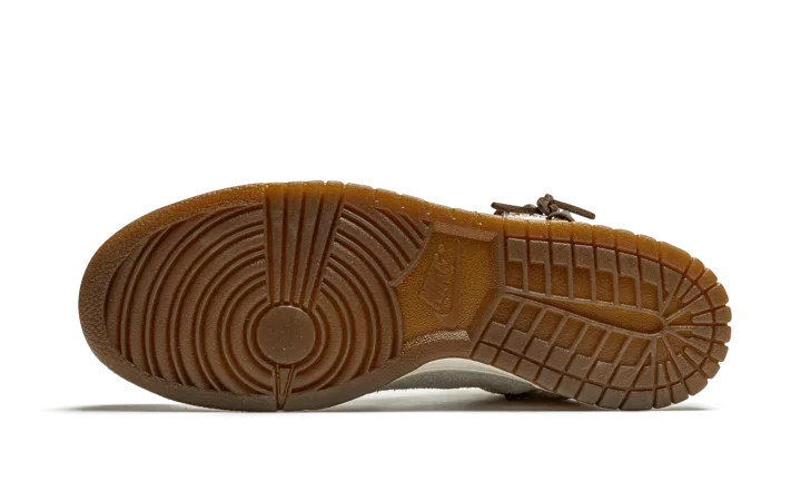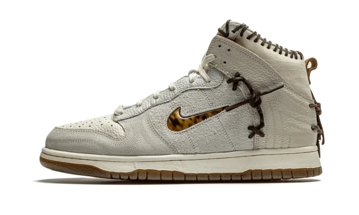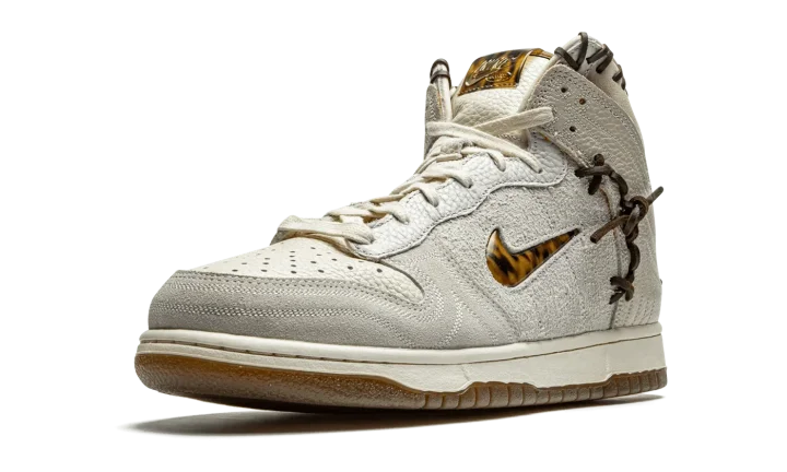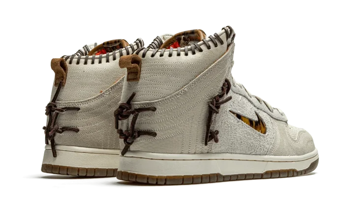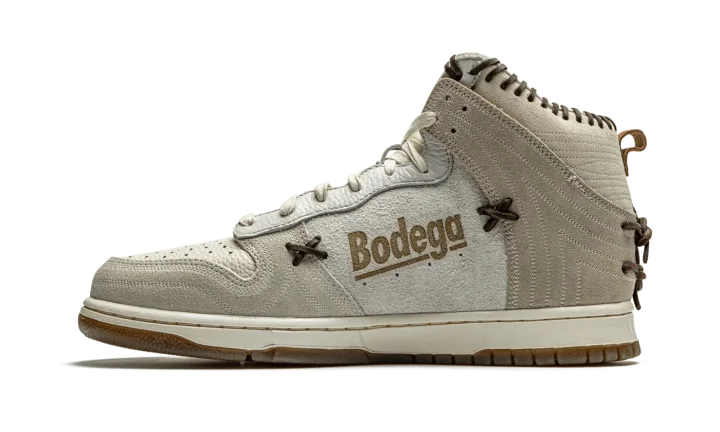 The Bodega x Nike Dunk High "Friends and Family" is an unreleased version of the collaboration between the New England based boutique and Nike on the retro basketball shoe that was given to friends and family of Bodega. The "Friends and Family" is based on the "Legend" colorway of the high-top Dunk created by Bodega, a style that "recaptures the mystique and feeling of discovery that once accompanied every special edition sneaker." As you can see, the "Legend" accomplishes that. Various cuts of premium leather designed to mimic the look of baseballs, baseball mitts, or even a saddle or well-worn boot can be found on the collar, mid-panel, and toe. Rawhide lacing can be found between the mid-panel and heel and on the collar and heel. A jeweled tortoiseshell Swoosh graces both sides. Overall, the mostly grey sneaker evokes a classic "Americana" aesthetic with rugged leather details.