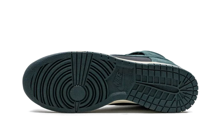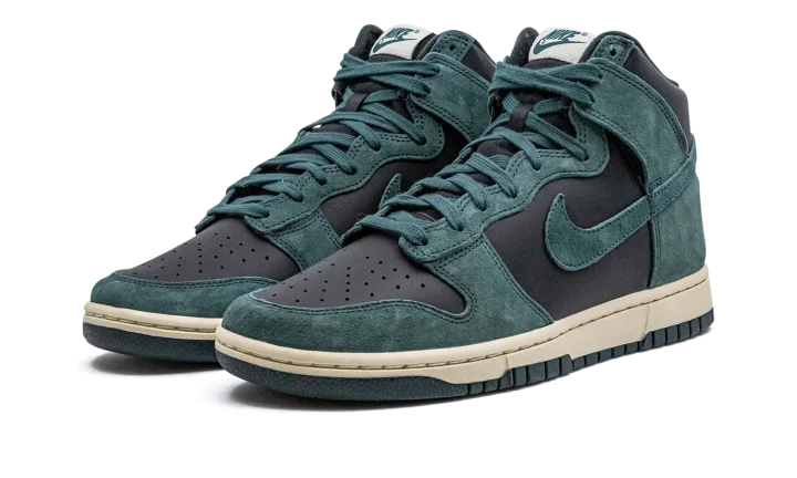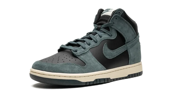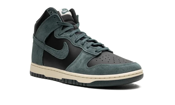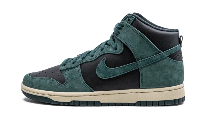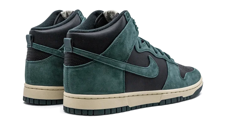 The Nike Dunk High "Faded Spruce" is another easy-on-the-eyes colorway of the classic basketball shoe. The "Faded Spruce" Dunk High features a black leather base with Faded Spruce pigskin suede overlays and Swoosh branding. A Faded Spruce "Nike" logo and Swoosh emblem appear on the white nylon tongue tag. Channeling the Dunk's 1980s roots, the "Faded Spruce's" midsole is given a pre-aged look. Release date: March 14, 2023