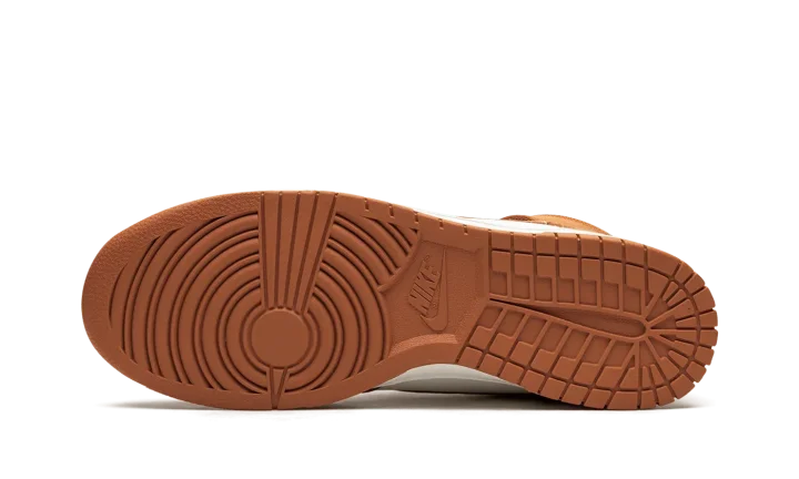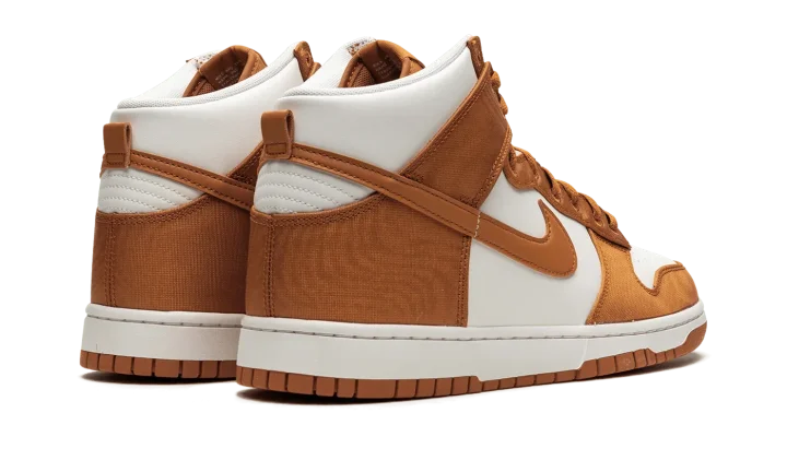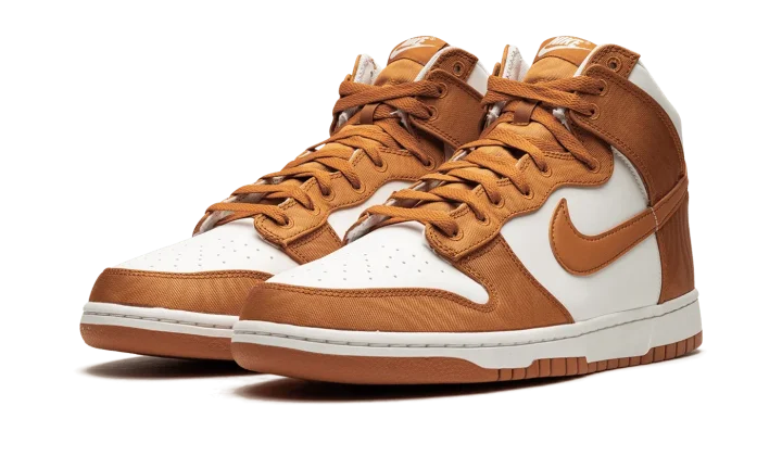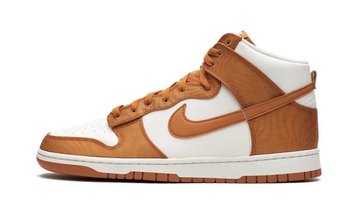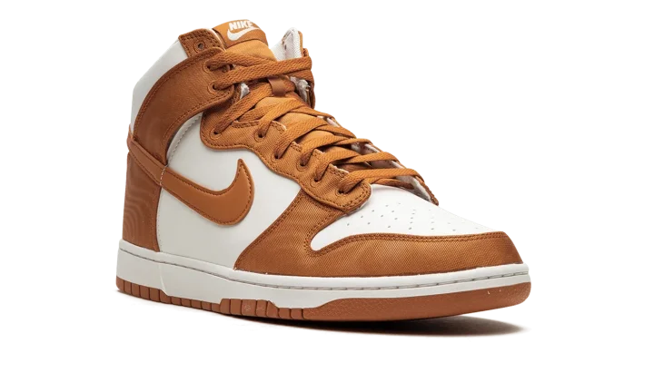 The Nike Dunk High "Monarch" is a white-and-orange colorway of the retro basketball shoe with a fresh blend of materials on its design. The "Monarch" features a white leather base with Monarch, or orange, nylon overlays. A Monarch-colored leather Swoosh logo is found on both sides of the shoe. Additional orange accenting appears in the form of "Nike" and Swoosh branding on the tongue tag. A white rubber midsole and orange outsole complete the look. Release date: April 28, 2023